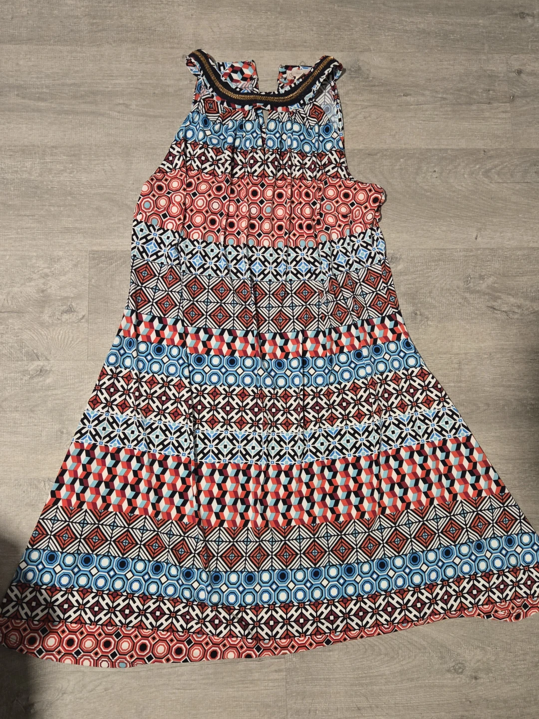Here's a fun and colourful sleeveless dress! It features a unique geometric pattern with red, white, and blue colours. Perfect for summer or upcoming VACAY!!!