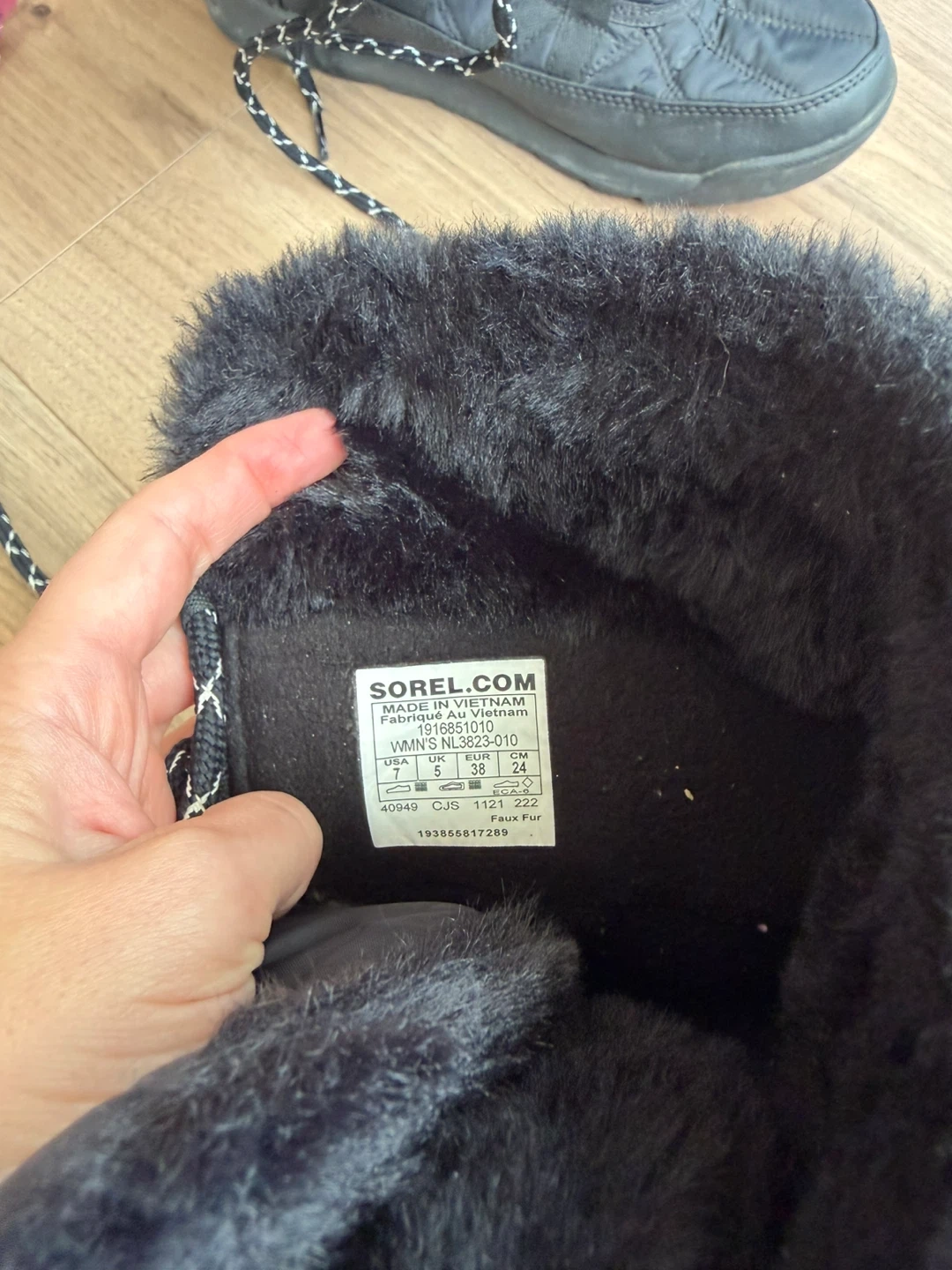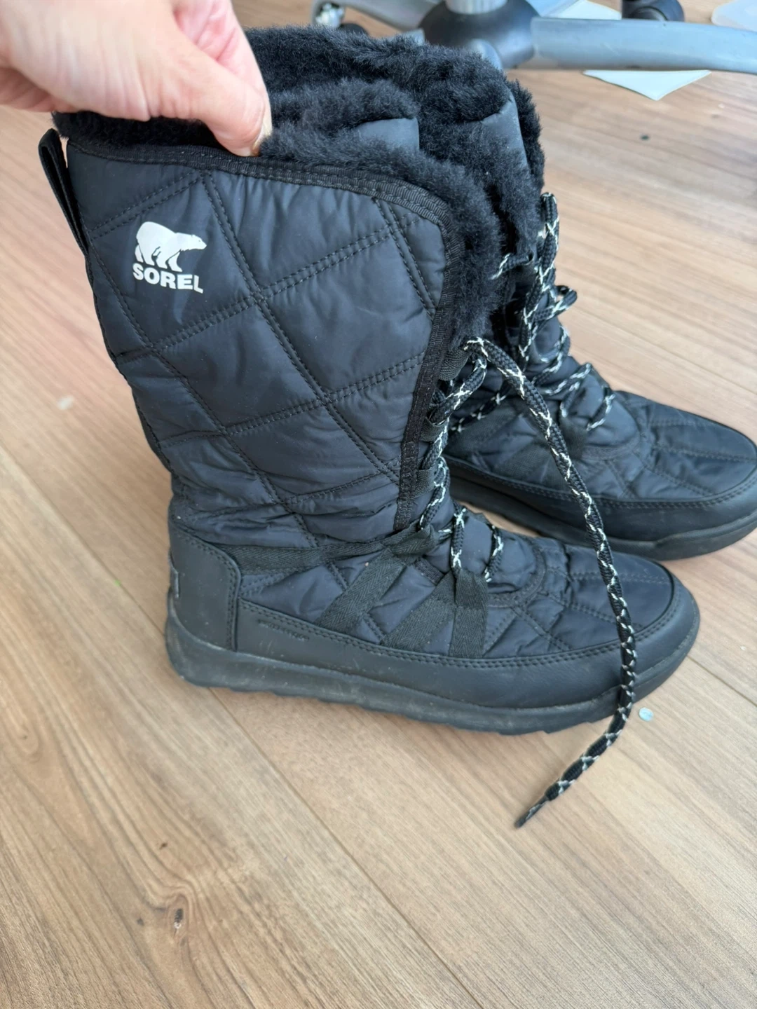 10Selling a pair of Sorel women's winter boots in size 7. They are black and have a quilted design with faux fur trim. Perfect for keeping your feet warm and dry this winter!