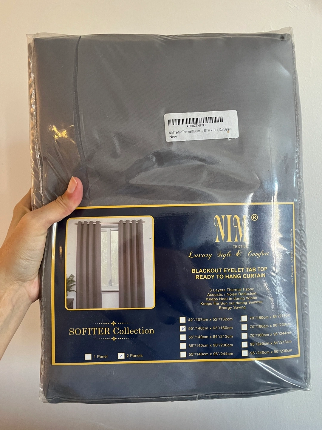 I'm selling a brand new NIM Textile thermal insulated curtain in dark gray! It's 55" x 63". 2 panels. This blackout eyelet tab top ready to hang curtain is part of the Softer Collection. It features 3 layers of thermal fabric that keeps heat in during winter and keeps heat out during summer, saving energy. Bought in Amazon and didn’t use it.