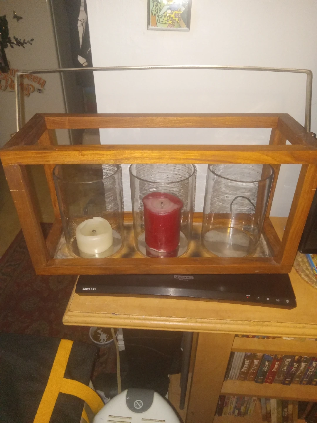 Here's a lovely wooden candle holder with three glass inserts. It's perfect for adding a warm and cozy touch to any room in your home!