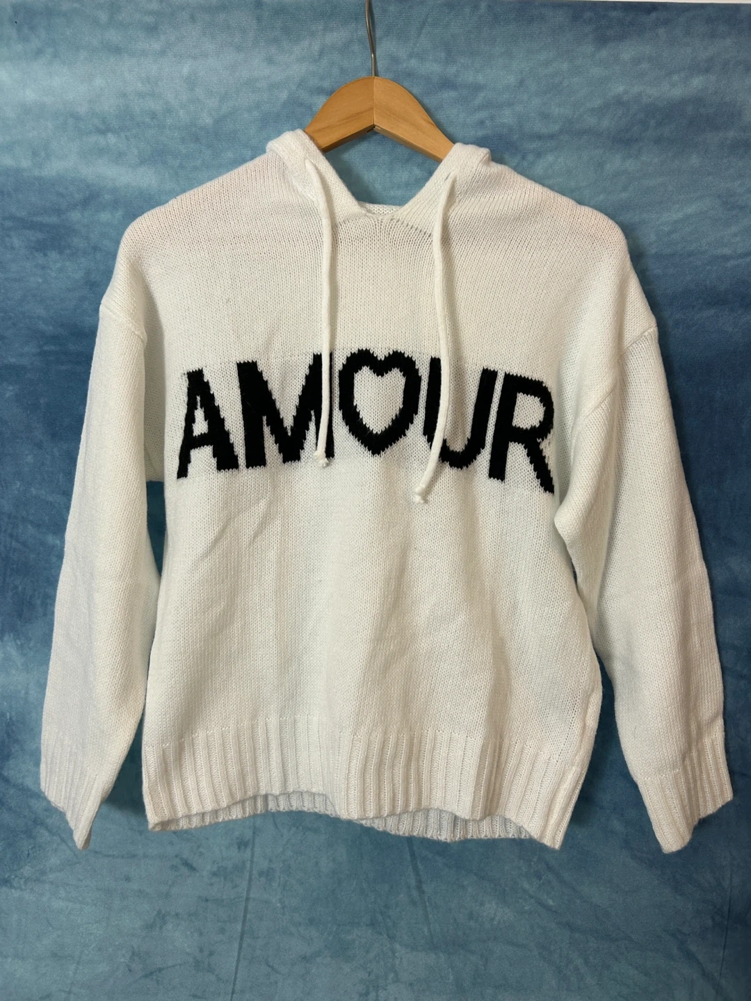 Selling a cozy white knit hoodie with 'AMOUR' written across the front! It's super soft, comfy and perfect for layering on those chilly days. In brand new, never worn condition!