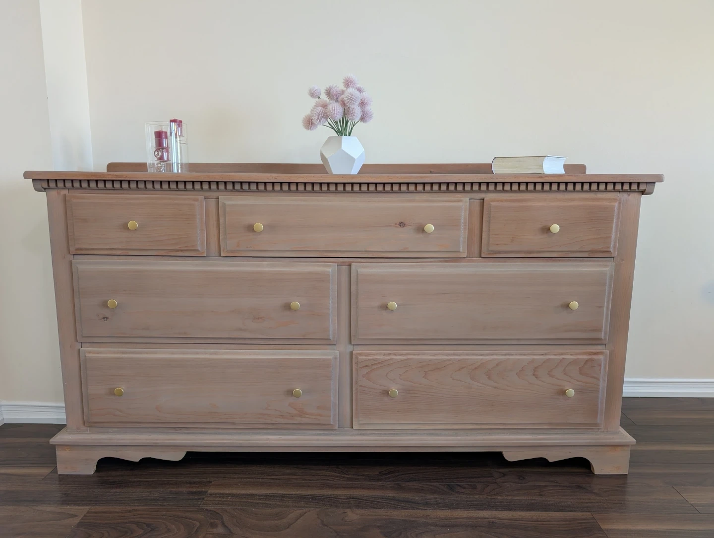 Here's a lovely re-finished wooden dresser with seven drawers! It's perfect for adding storage and style to any bedroom. The drawers feature a nice geometric pattern inside, adding a touch of elegance to the piece.