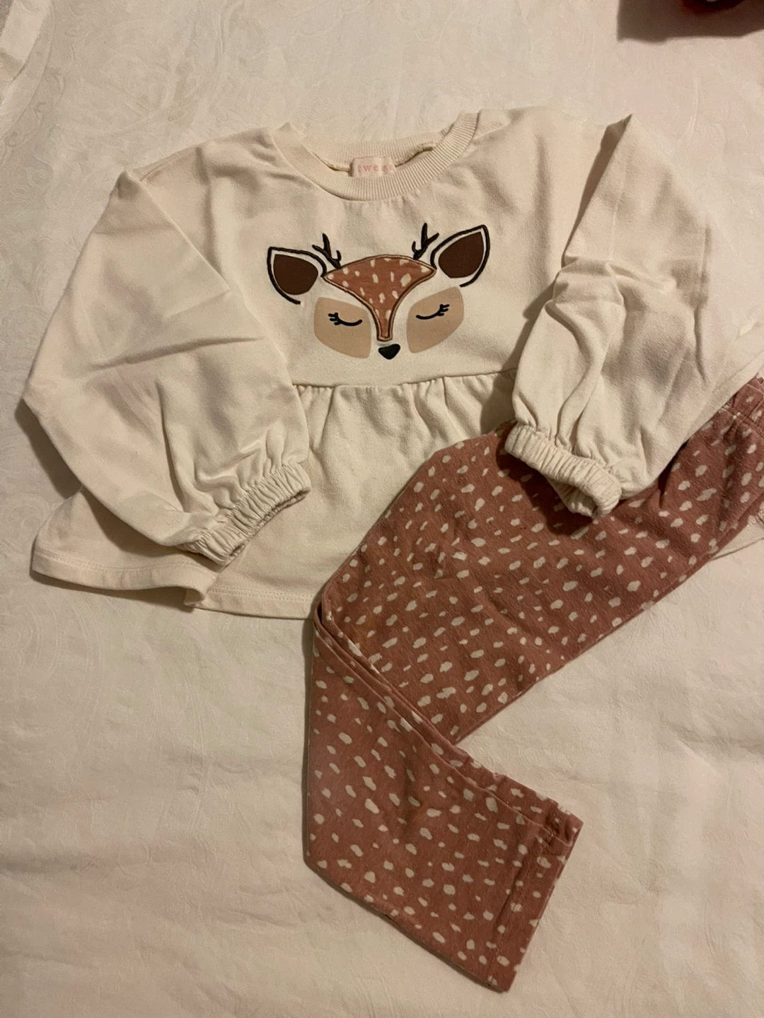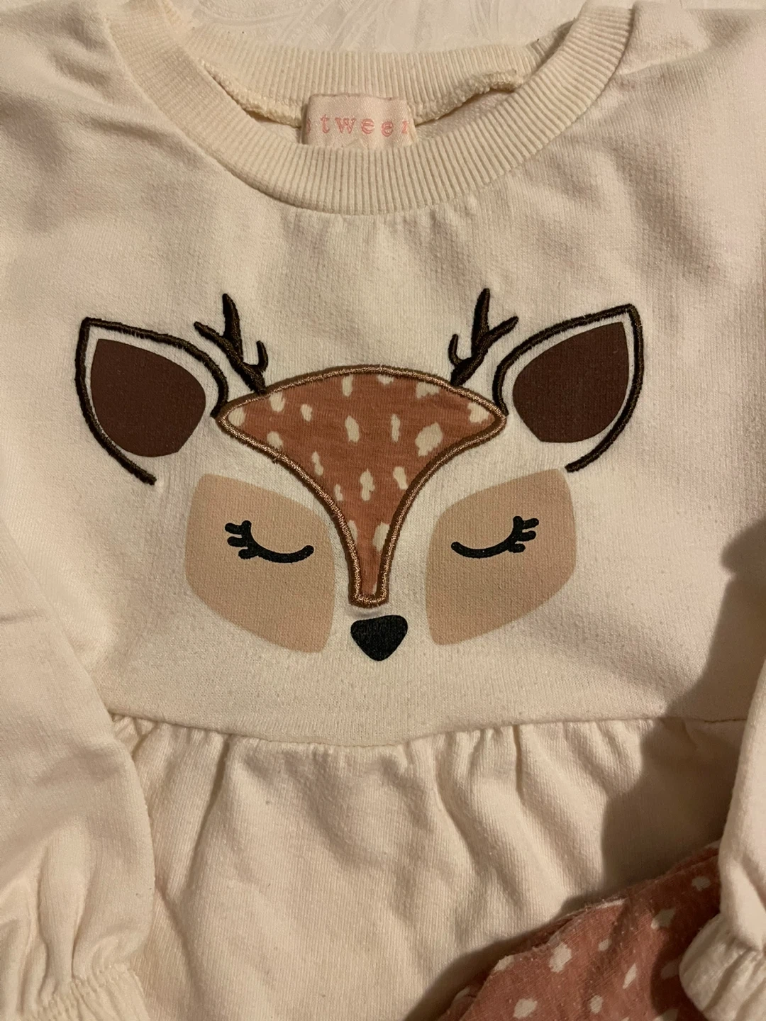 Super cute outfit for your little one! This set includes a long-sleeved top with an adorable deer design and matching spotted pants. It's in good used condition and ready for a new home! Well love and used