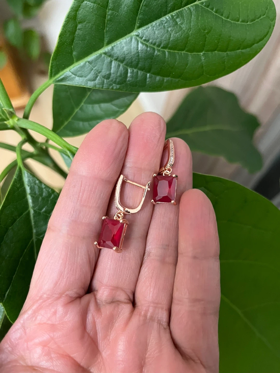 These are a pair of lovely drop earrings featuring a red gemstone in a square setting. They have a classic and elegant design!