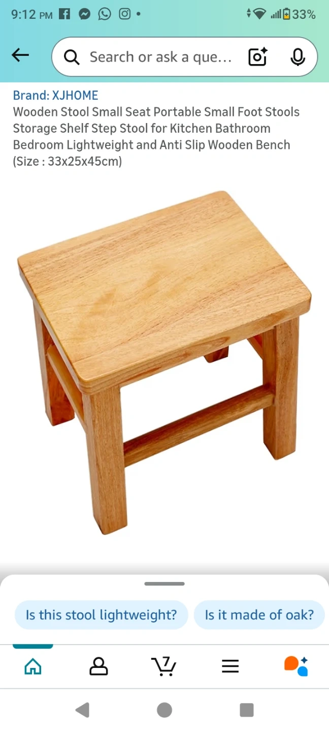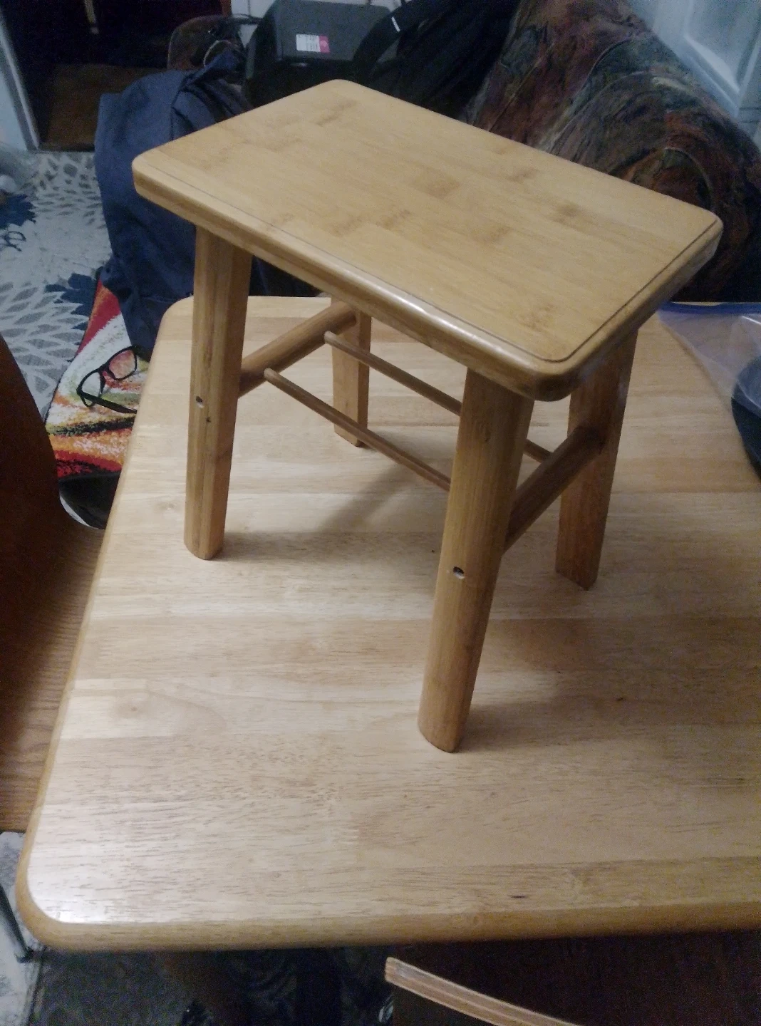 This is a wooden stool, perfect as a small seat or footstool! It's lightweight and portable, making it easy to move around your home. The stool is made of wood and measures about 11 x 7 inches. It's in great condition and ready for a new home!