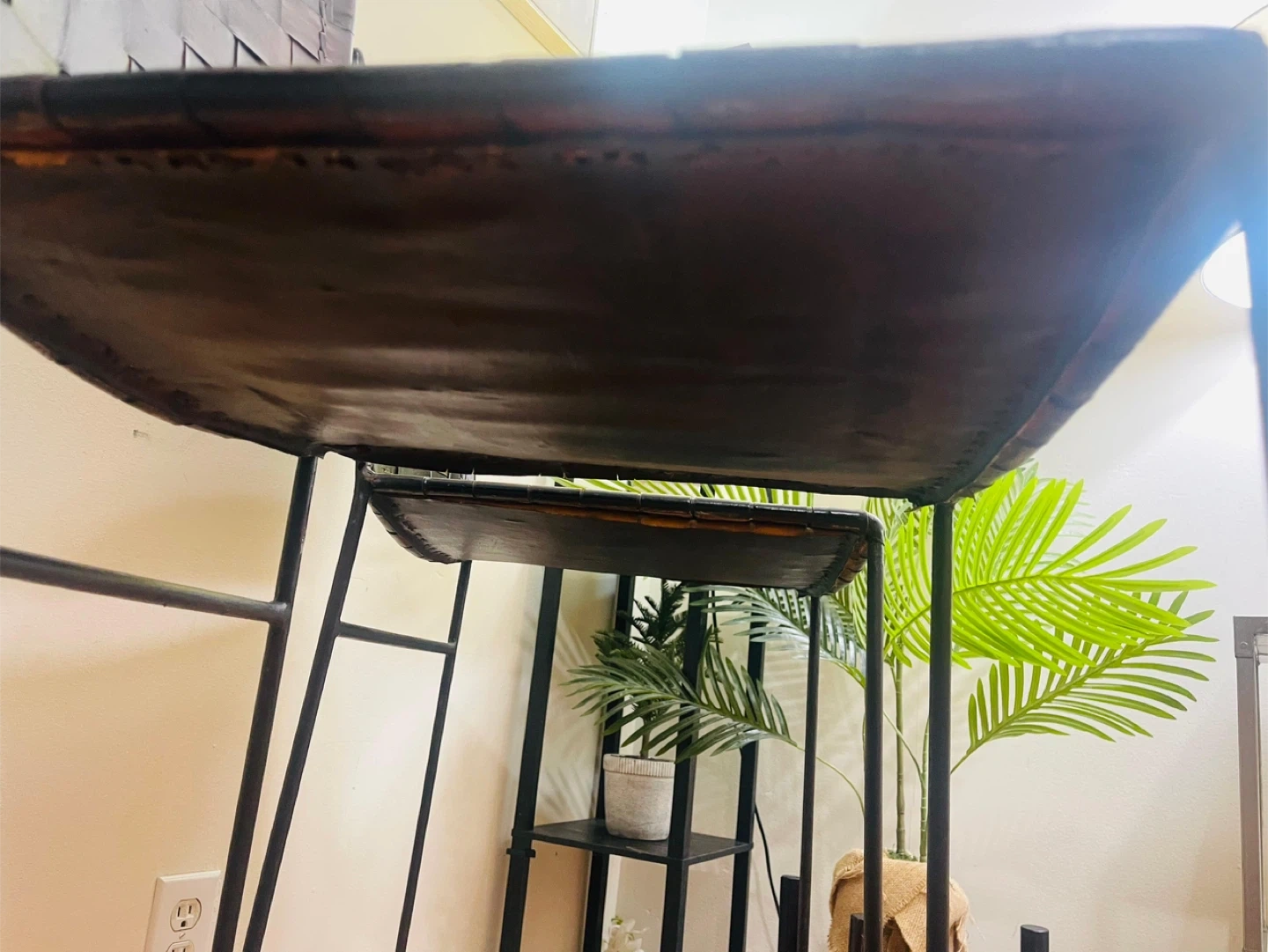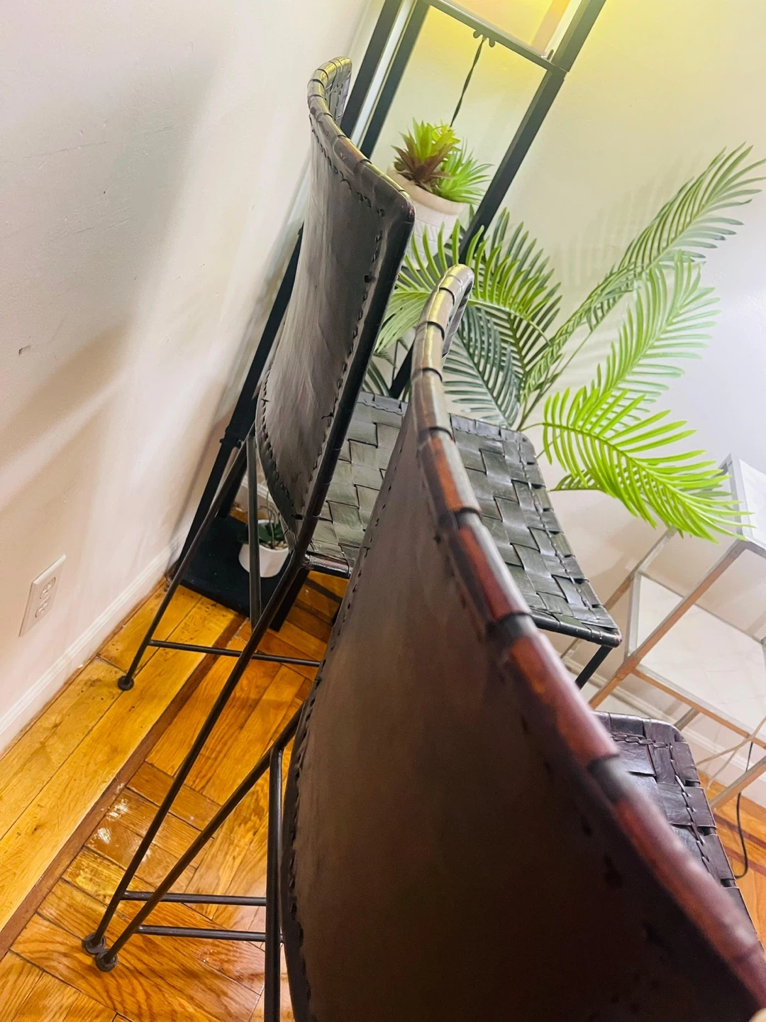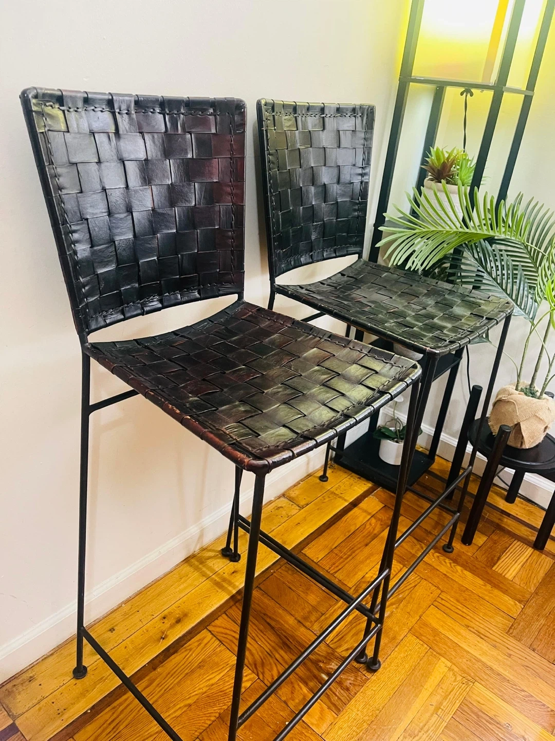 Selling a set of two woven leather bar stools. They're in great condition and would look great in any kitchen or bar area. The woven leather adds a touch of texture and sophistication to your space!