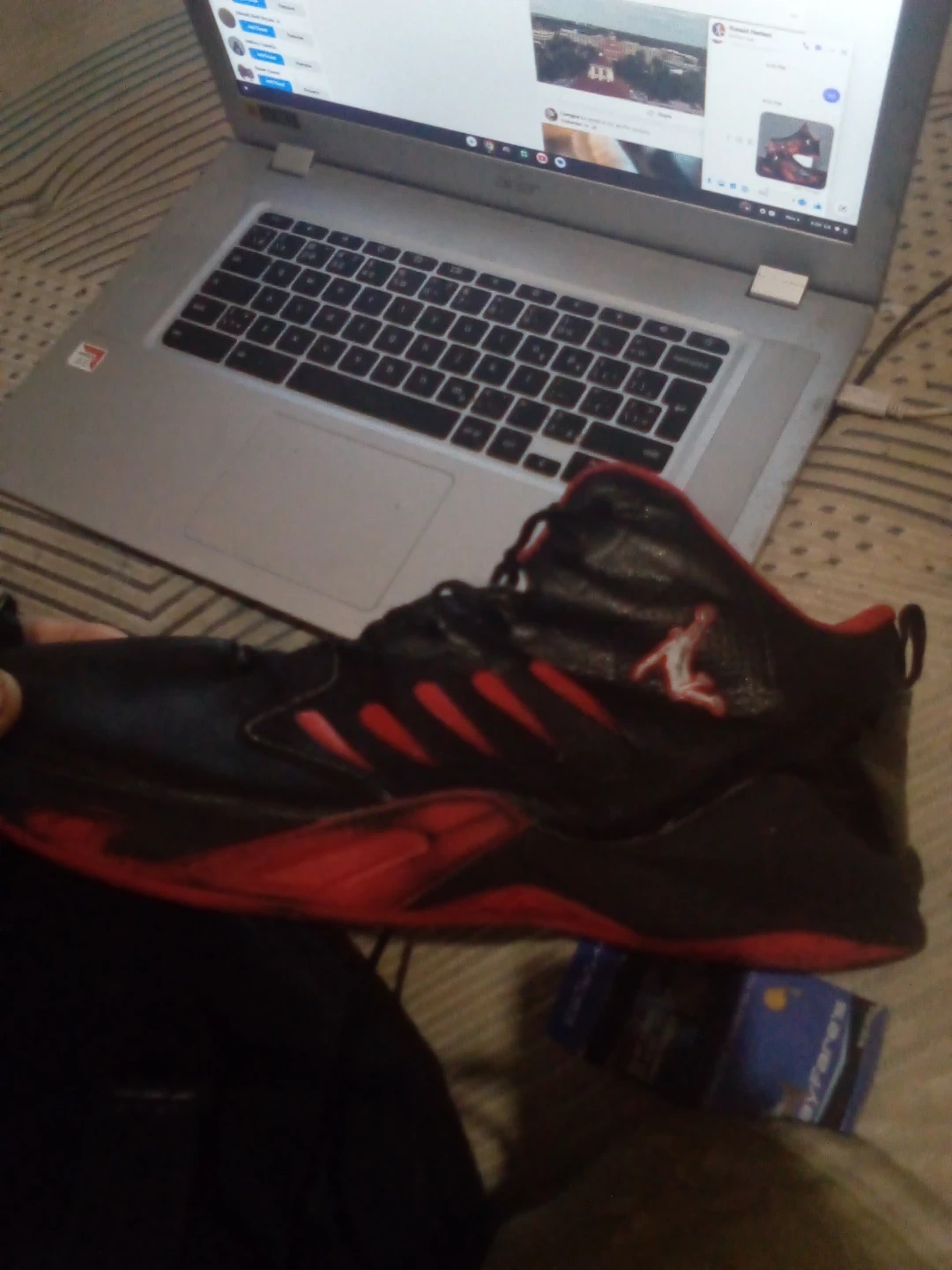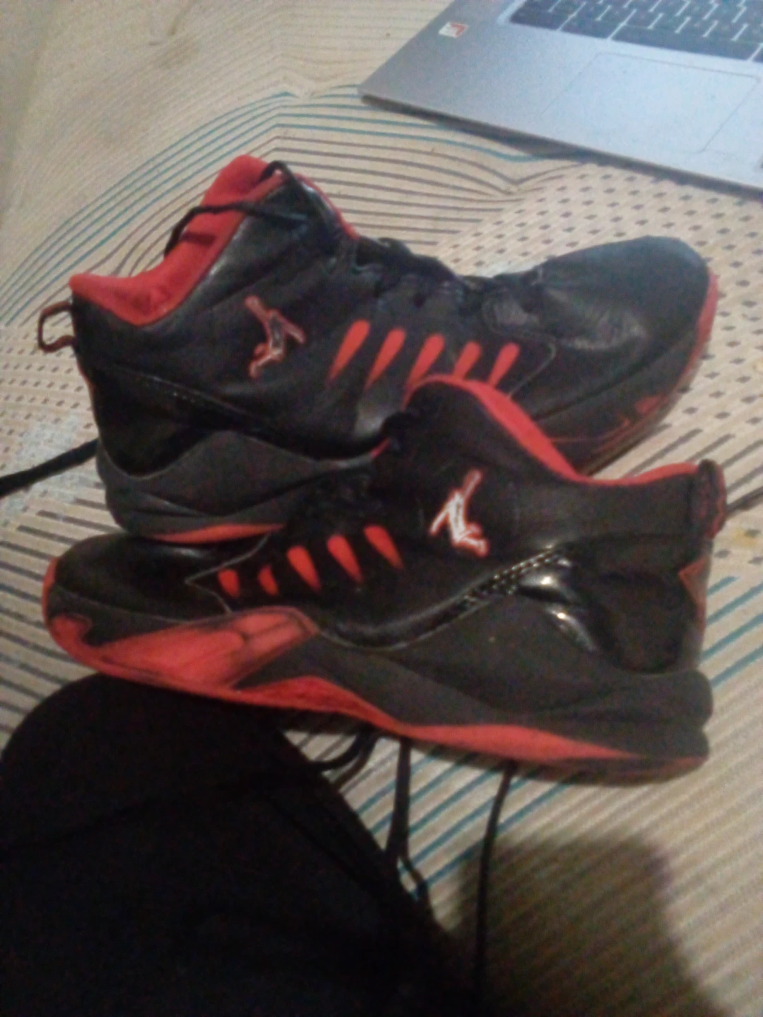 Selling a pair of black and red basketball shoes! They're in good condition and ready for a new home. Perfect for hitting the court or just casual wear. Fake Jordans but still good quality. Can you spot the difference? Can meet somewhere central.