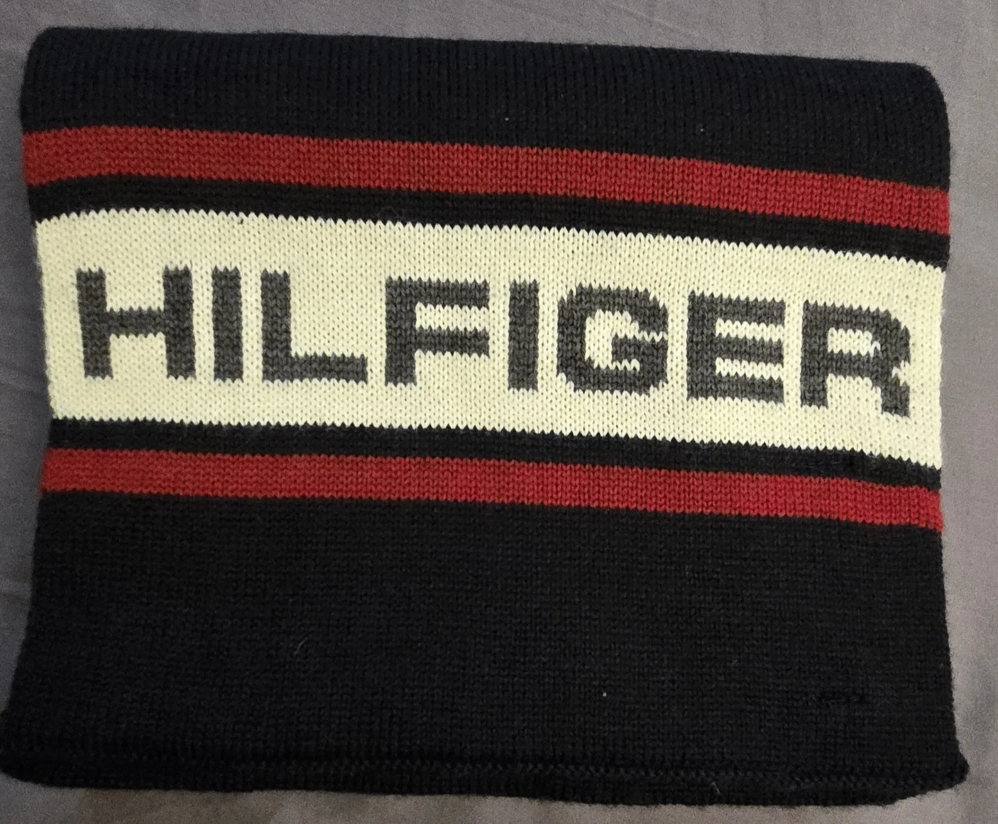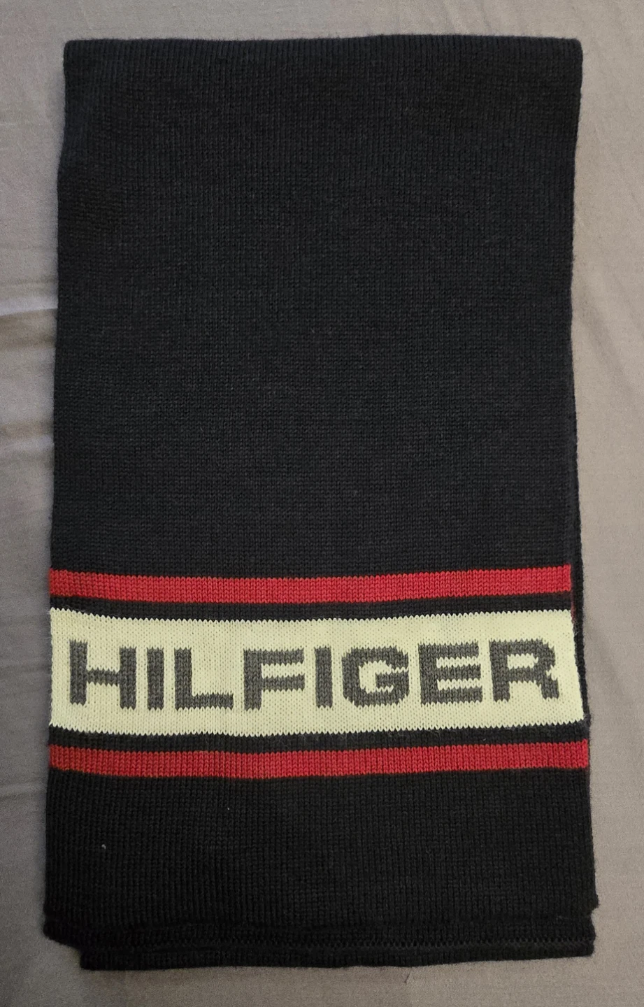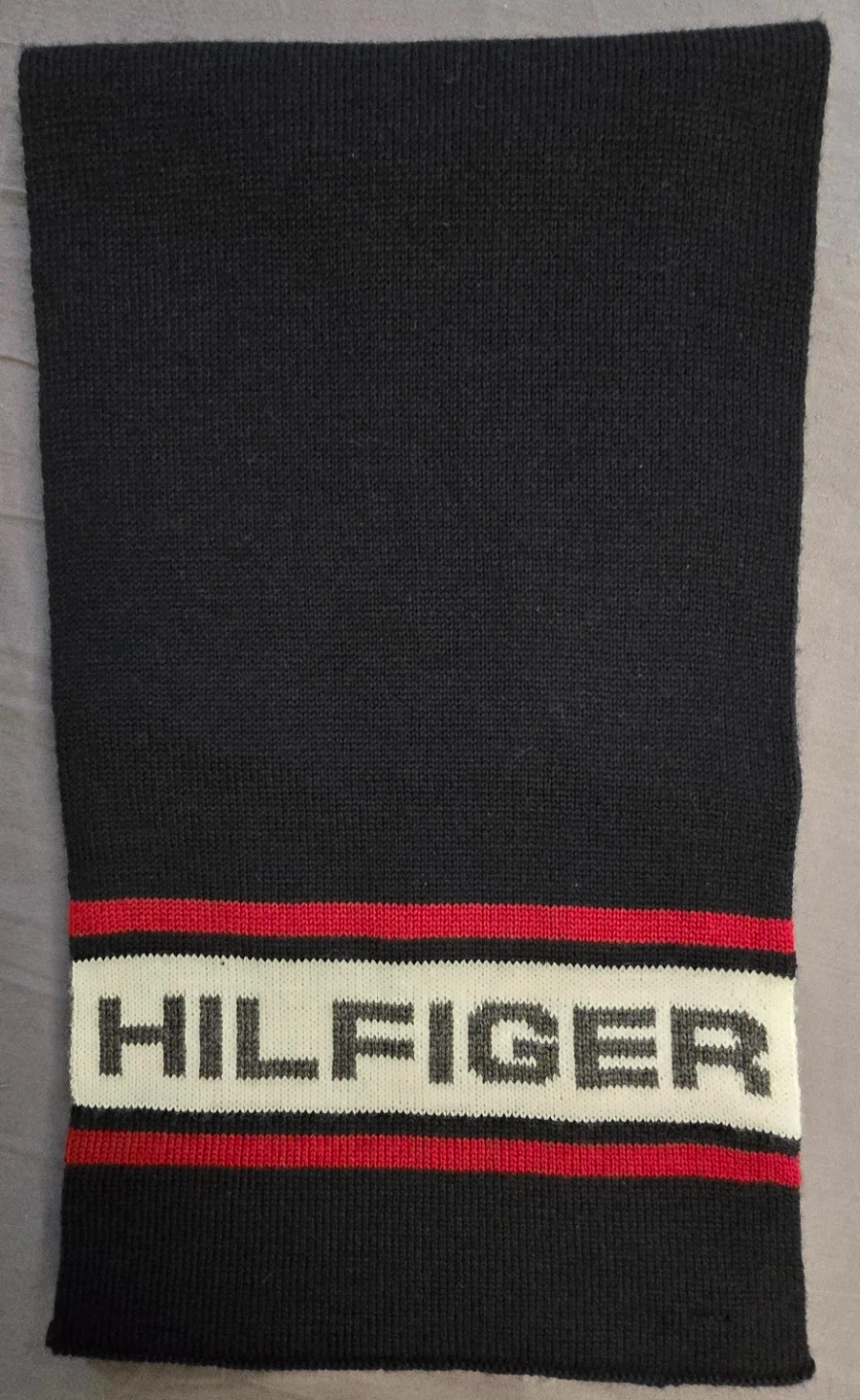 Cozy Tommy Hilfiger scarf in black! It features the brand's name in a stripe design. It measures approximately 32 5" inches in length. Perfect for those cold winter days!