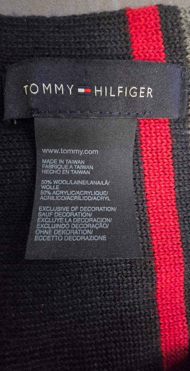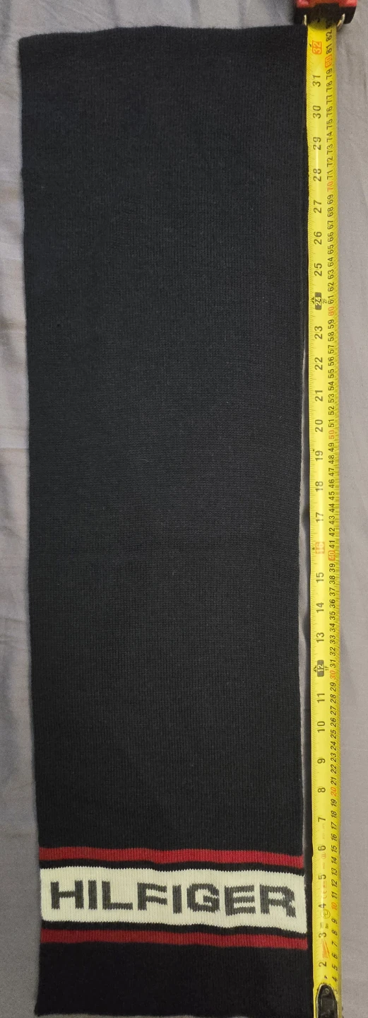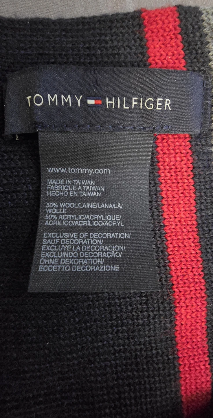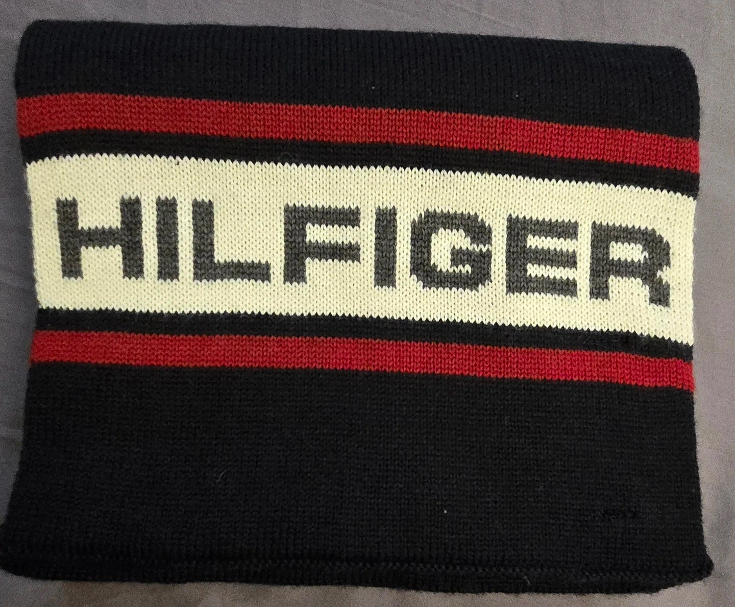 Cozy Tommy Hilfiger scarf in black! It features the brand's name in a stripe design. It measures approximately 32 5" inches in length. Perfect for those cold winter days!