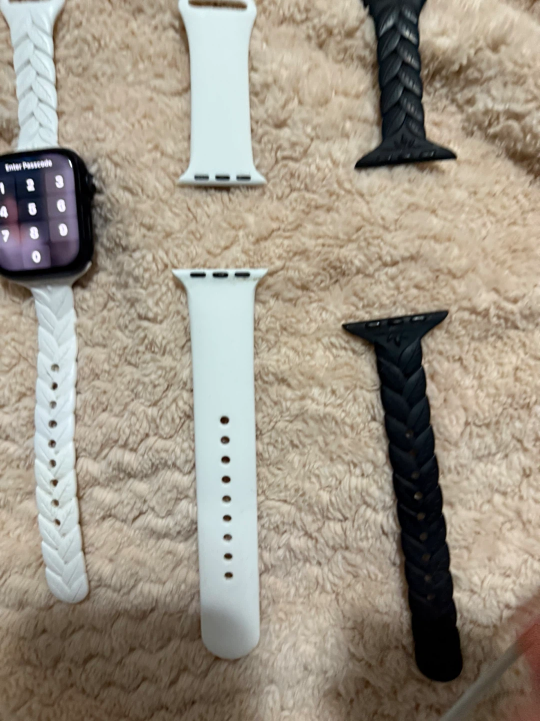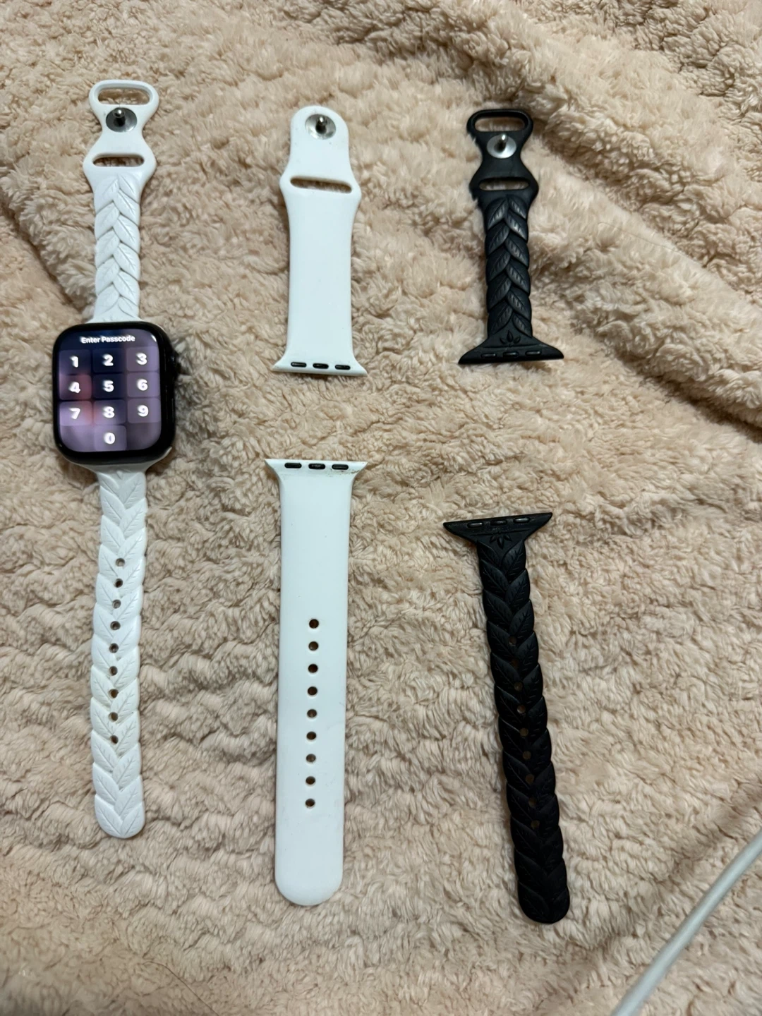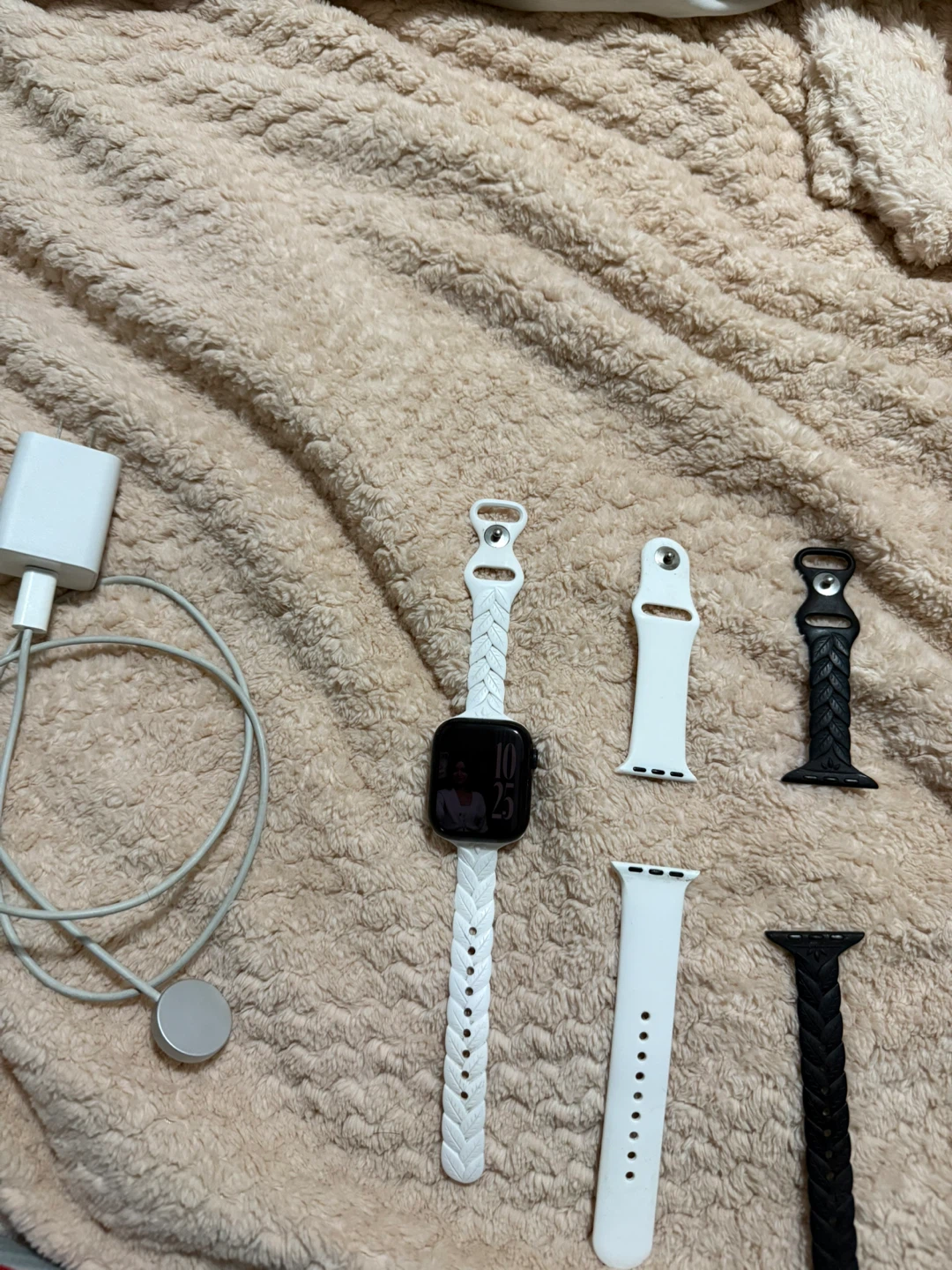 Selling an Apple Watch with multiple bands and a charger! The bands are in both white and black. Perfect for switching up your style!