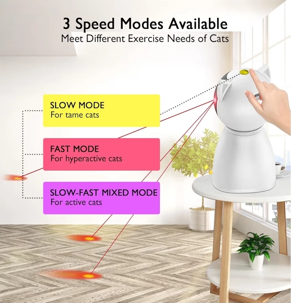 Keep your feline friend entertained with this laser toy! It features an authentic random trajectory to mimic natural hunting behaviour. The recommended placement height is 8-35 inches. It has a motion sensor with a smart start and sensing distance up to 160 inches. The rechargeable 1000 mAh battery charges in 2.5 hours and lasts for 2 days. There are 3 speed modes available to meet different exercise needs of cats.