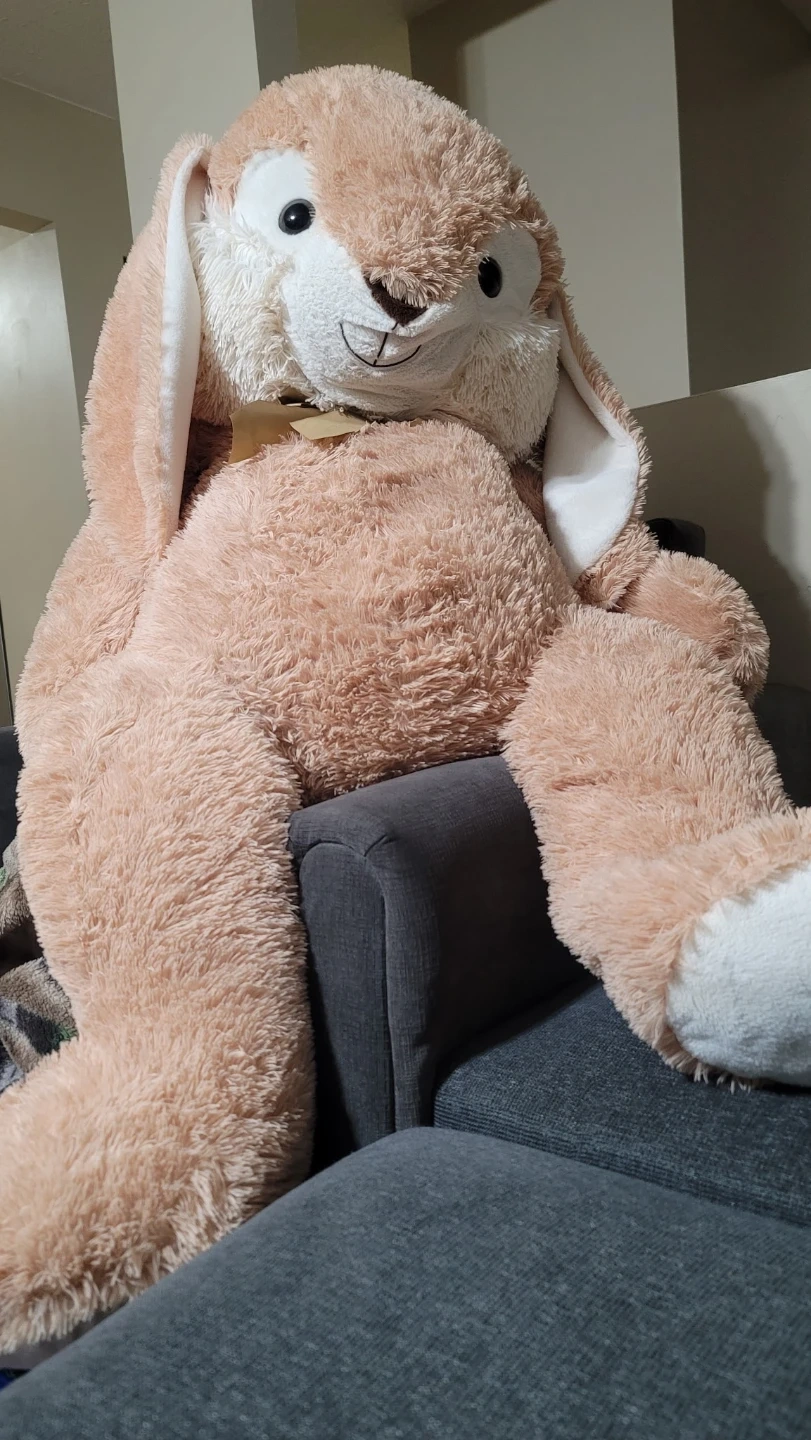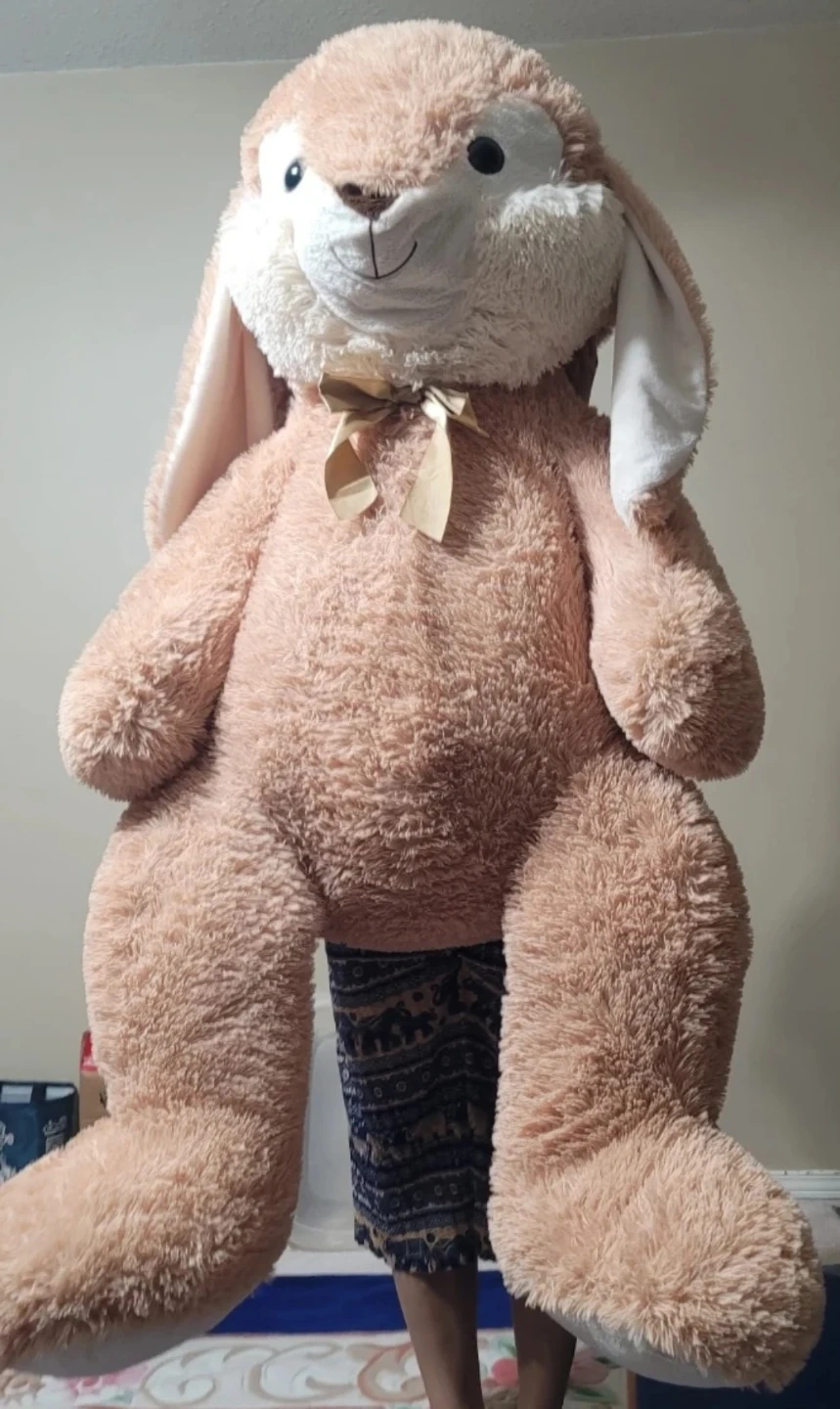 76Super soft and cuddly large bunny plush, approximately 3.5 feet tall when sitting (around 4 feet full length). Excellent condition — clean, no stains or damage. Comes with a cute gold satin bow. Perfect as a gift, nursery decoration, or cozy room accent.