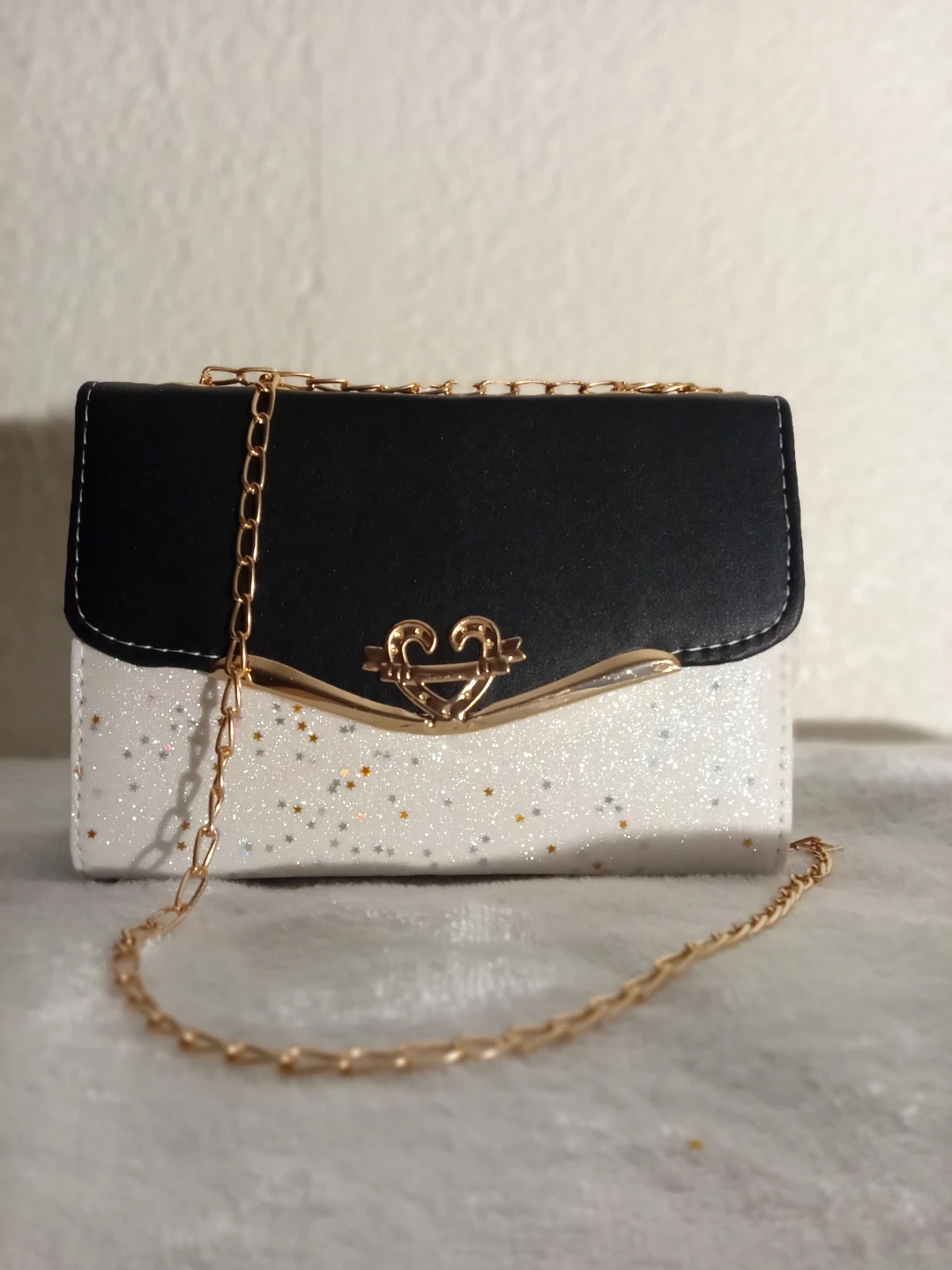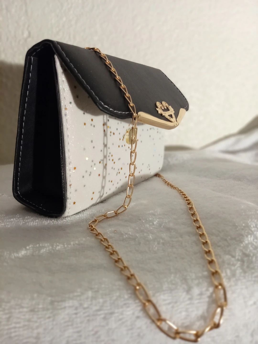 This is a cute black and white shoulder bag with a gold chain. It has a small zipper pocket inside. Perfect for a night out or a special occasion!