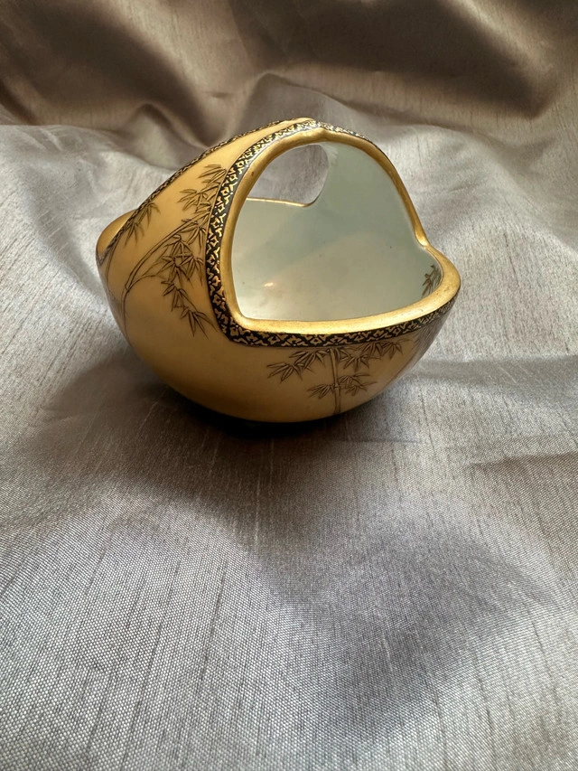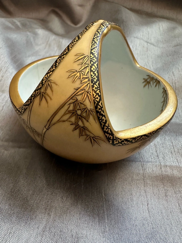 Shimizu Miyama, Signed Master Craftsman of Gold Antique Japanese Bowl With Handle Kutani Bamboo design Meiji Period 1868 - 1912 Signed by Shimizu Miyama Excellent condition Measures 4 inches tall x 5 inches long by 4 inches wide. Condition: Used - Like new. More Info: Vintage, Antiques. For Sale By: Owner. Curbside pick up: Yes. Cash accepted: Yes