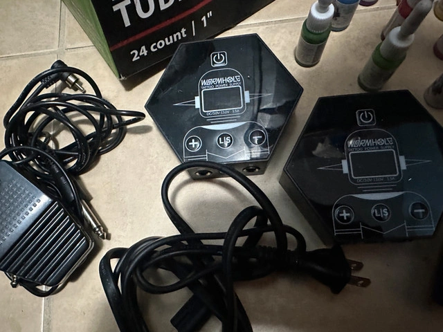 Coil + Rotary Machines | 3 Power Supplies | Inks | Tubes | Ready to Work! Setting up a new station or levelling up your gear? This all-in-one kit has EVERYTHING — no waiting, no hunting for parts. Plug in and go. Includes: • Coil tattoo machine (black/red) • Purple rotary tattoo pen • ⚙️ 3 digital power supplies (2 HAWINK + 1 V2 AirB yellow) • Foot pedal + 2 clip cords • Sealed cartridge needles • 2 boxes of EIKON Griffin Tubes • 1 box of MITCH Disposable Rubber Grip Tubes • 13 bottles of assorted tattoo inks • Black spray bottle • All cords, cables & accessories included