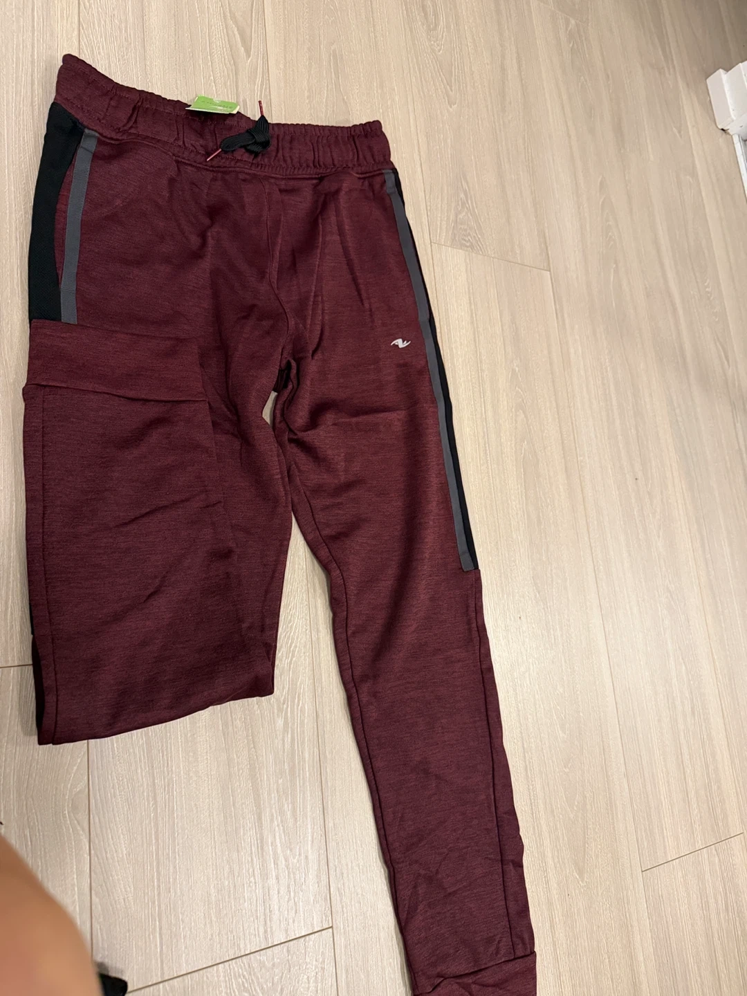 Selling a pair of Athletic Works joggers in size XL (14-16). The joggers are burgundy with black and grey stripes on the sides. They are made of 92% polyester and 8% spandex