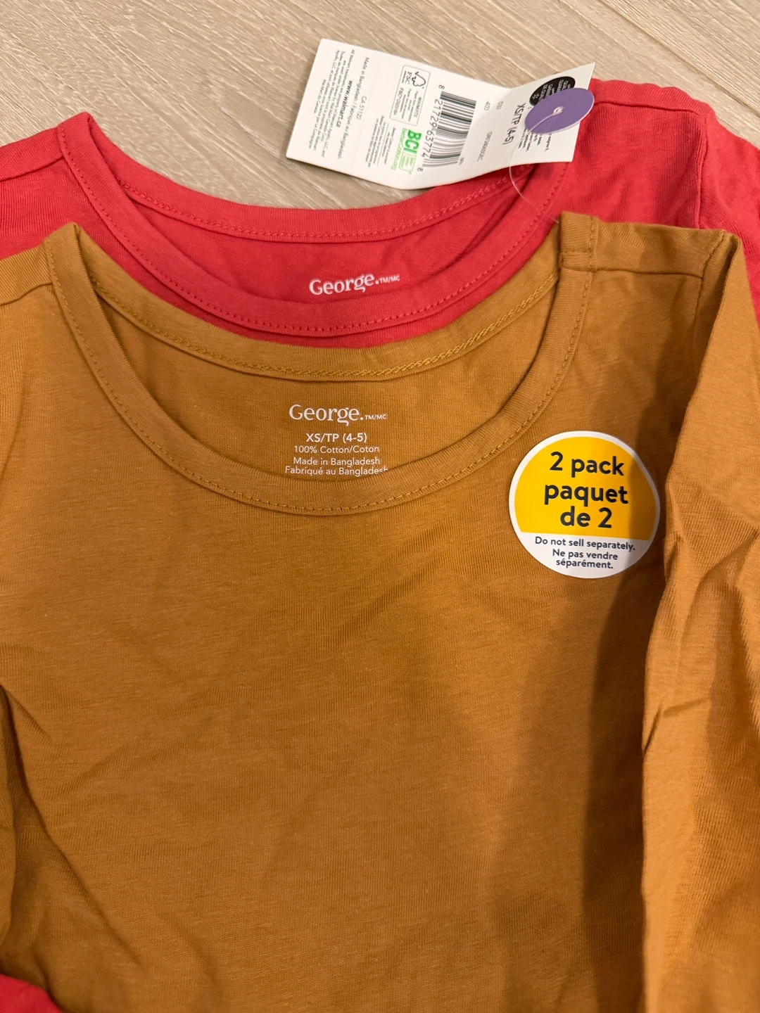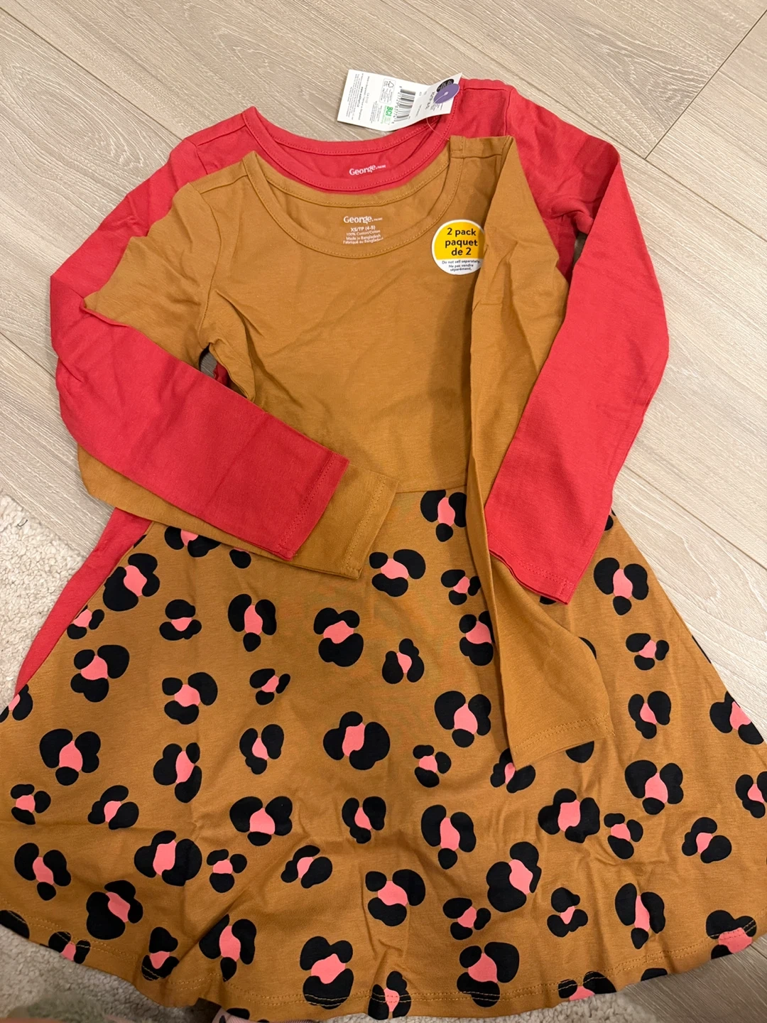 Two-pack of super cute and comfy long-sleeve dress for girls from George! Size XS (4-5). One shirt is a solid red colour, and the other is a solid mustard colour. Made of 100% cotton, so they're soft and breathable for your little one