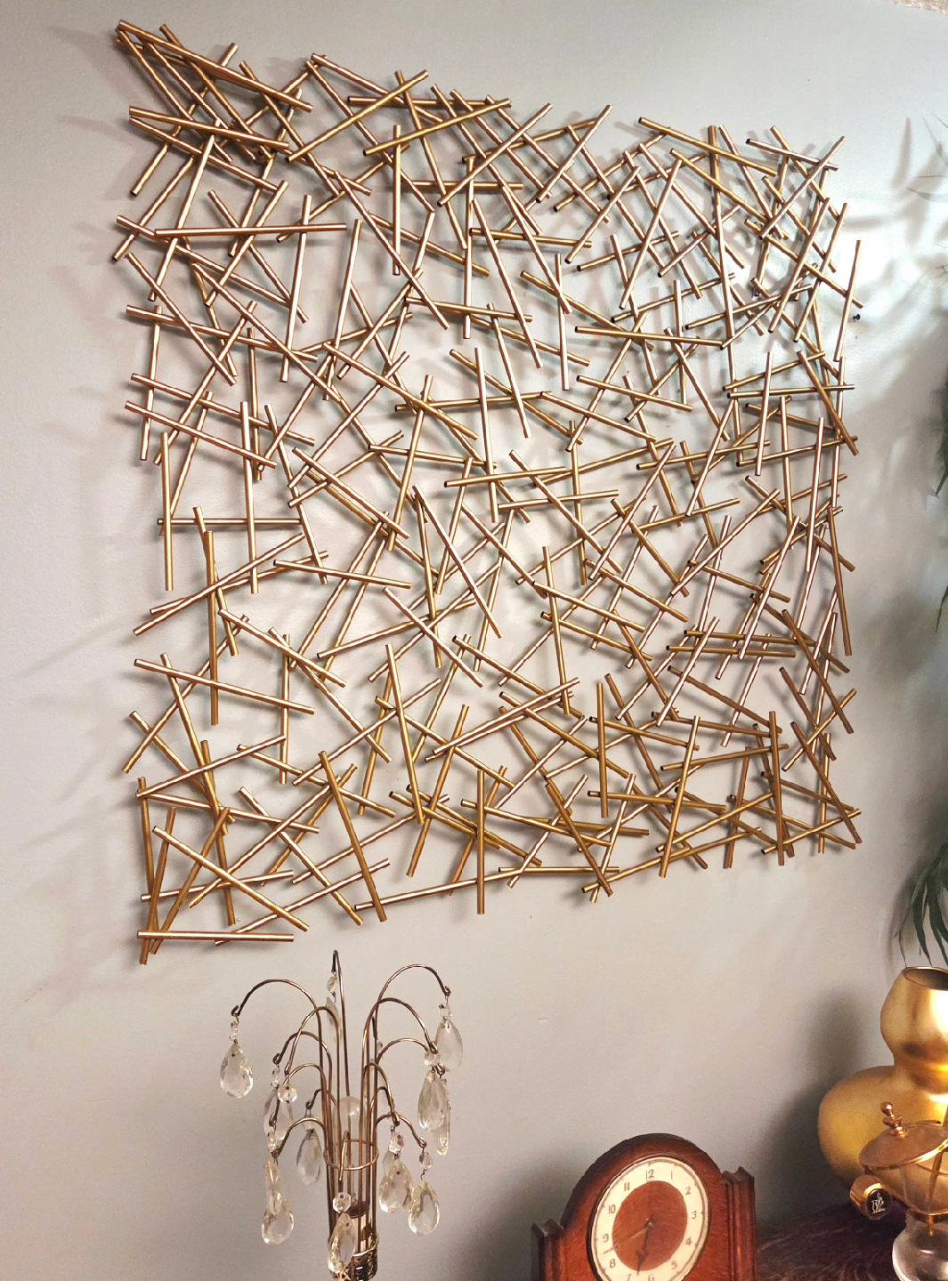 A stack of golden strands to add visual interest to your walls. Made of high-shine metal, it almost looks like a game of pick up sticks, but for the wall. Easy to hang for an instant update to your wall decor.