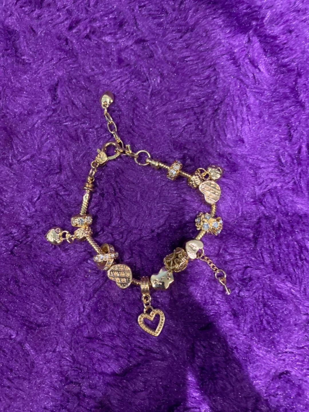 1000+Selling a plated gold charm bracelet. It has multiple charms including a heart, mickey mouse, and other decorative charms. It's in great condition!