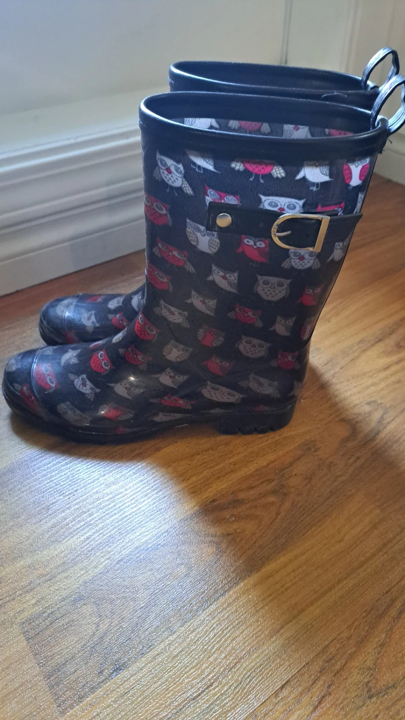 Cute Capelli New York rain boots with an owl pattern! They're a US size 9 and in great condition for keeping your feet dry on rainy days