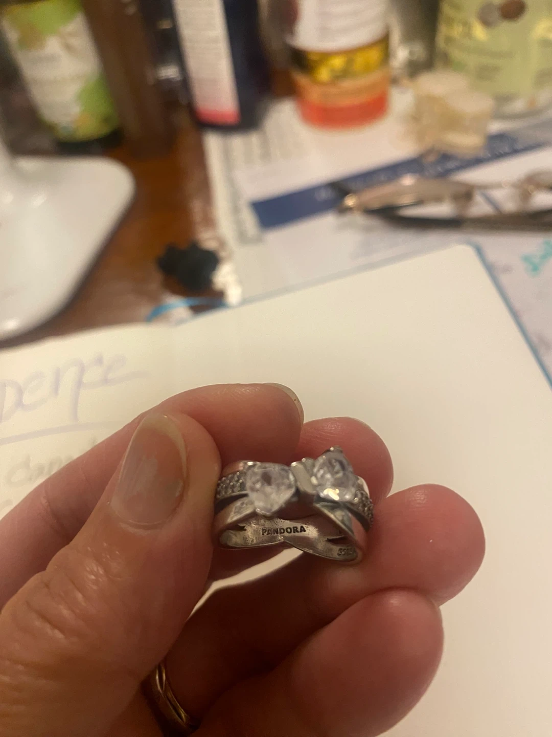 Selling a lovely Pandora ring! It features a unique design with what looks like heart-shaped stones. The ring is stamped with 'PANDORA' on the inside band and 'S925', indicating it's made of sterling silver. It's in great condition and ready for a new home