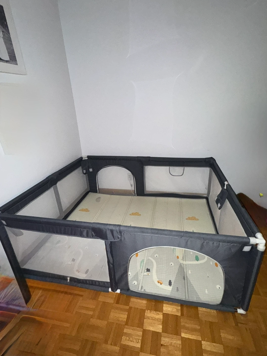 Selling a baby playpen in great condition! It's a safe and fun space for your little one to play and explore. The playpen is grey and features mesh sides for visibility and ventilation. It also includes a padded mat for extra comfort.