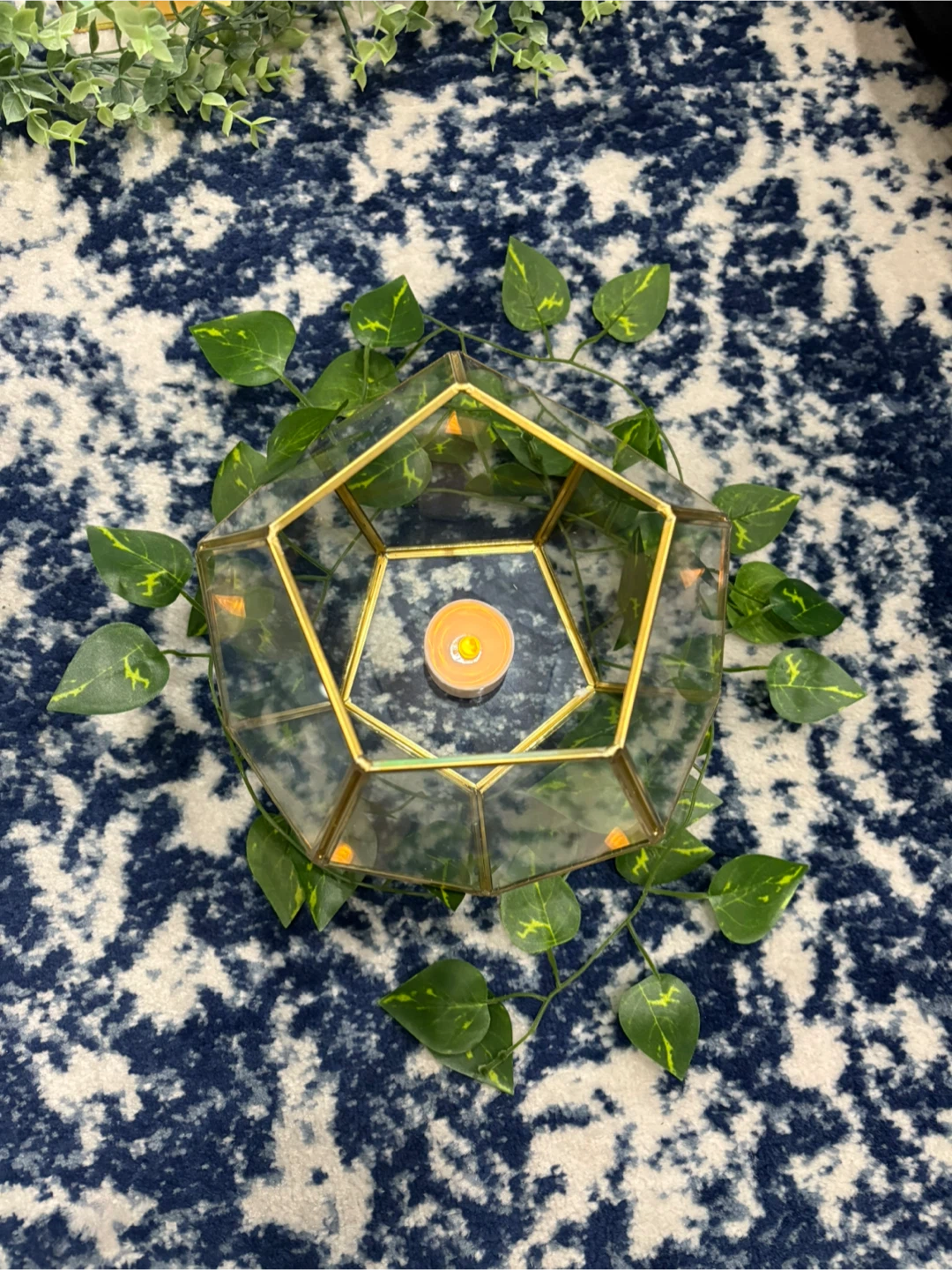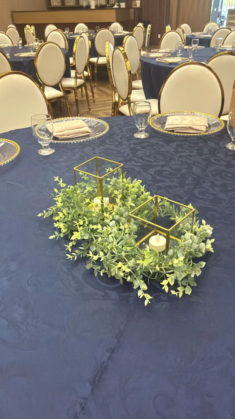Gold Centerpieces: rectangles, cubes, hexagons with greenery
