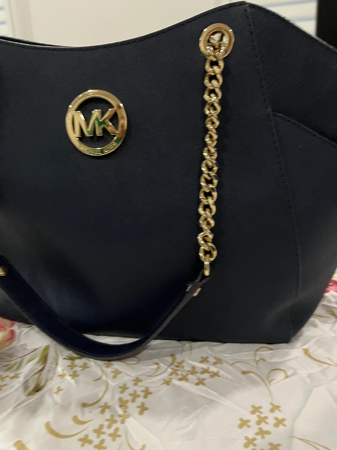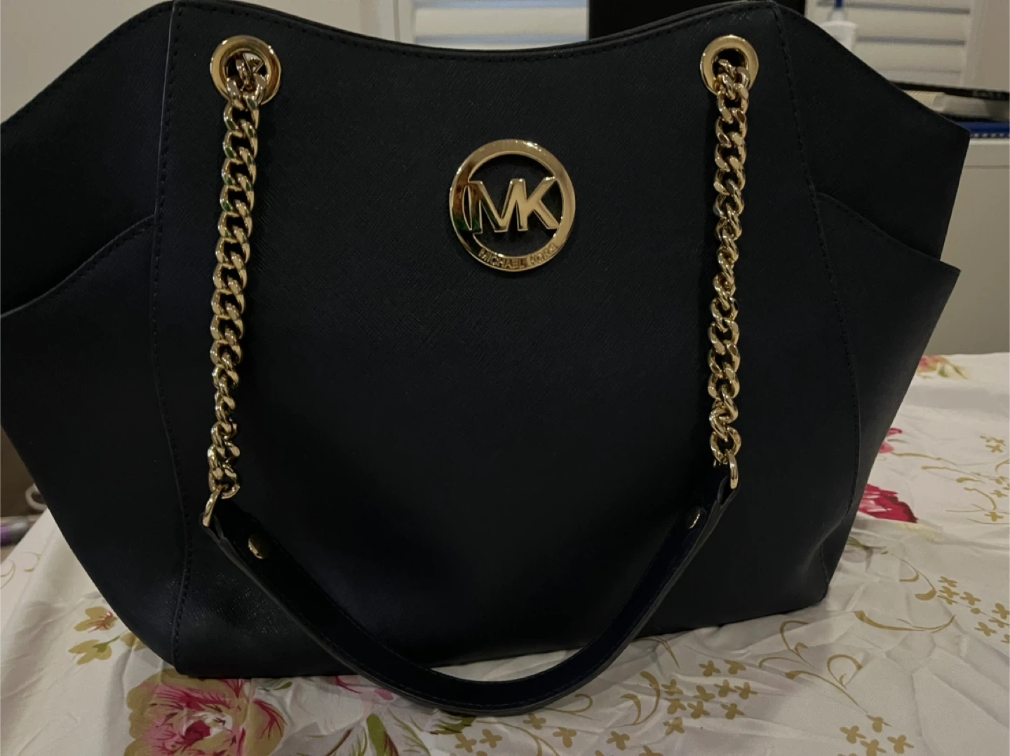 Selling a Michael Kors tote bag! It features a gold MK logo and gold chain detailing. It's in great condition and ready for a new home!