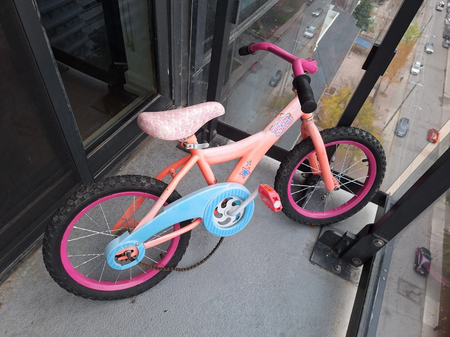 Selling a cute pink bike for girls! It has 16-inch wheels and is in great condition. The bike features a lovely pink and light blue colour scheme with a patterned seat. Perfect for a young rider!