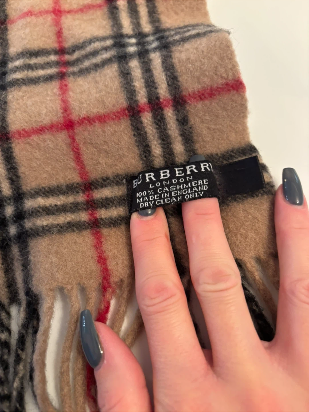 Selling a classic Burberry London scarf. It's made of 100% cashmere and is dry clean only. The scarf features the iconic Burberry plaid pattern.