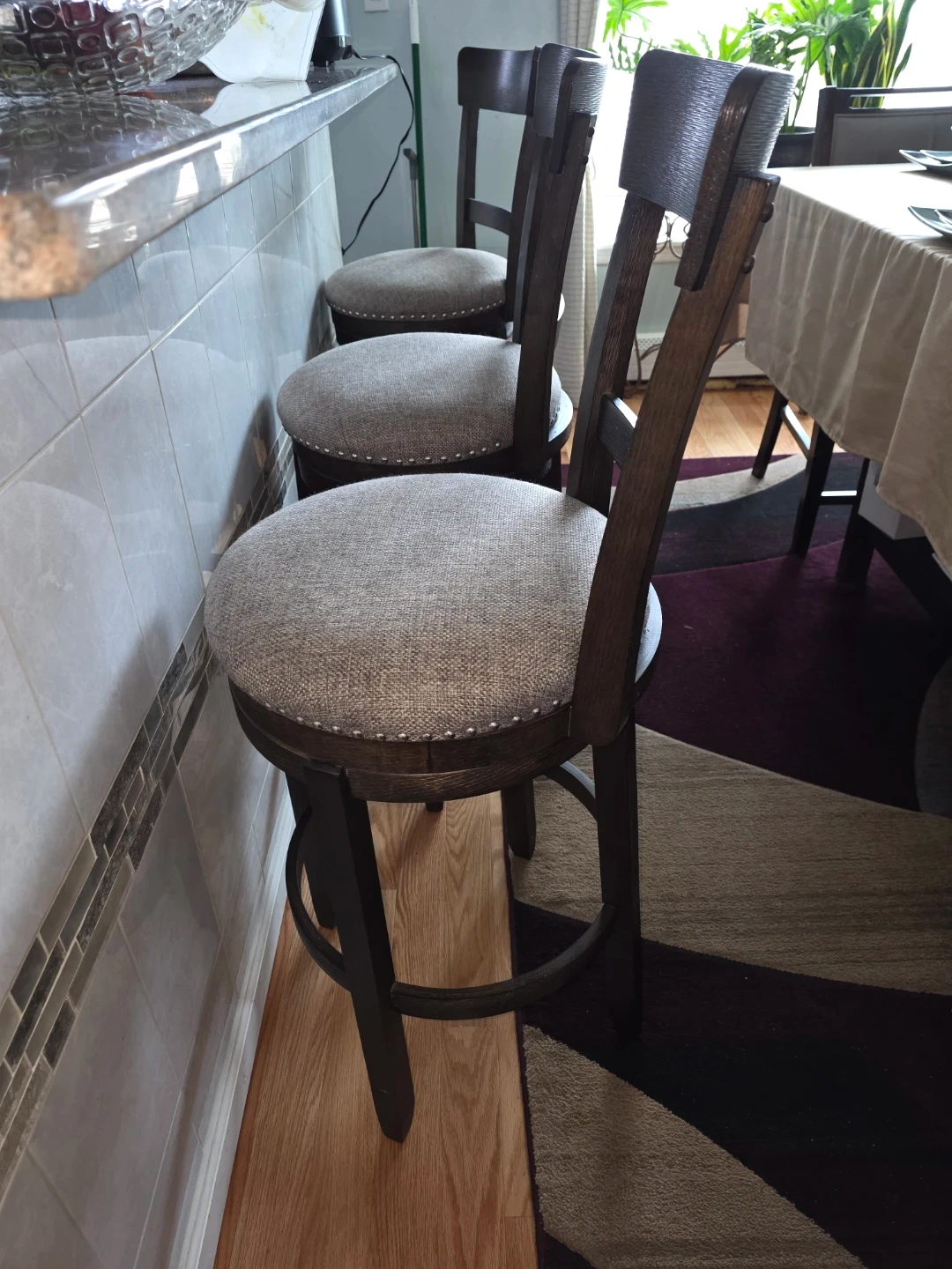 Selling a set of three bar stools. They're in great shape and would look fantastic in any kitchen or bar area. The stools feature a comfortable round seat and a supportive backrest, perfect for enjoying meals or drinks at your counter. They have a neutral color scheme that will easily complement your existing decor