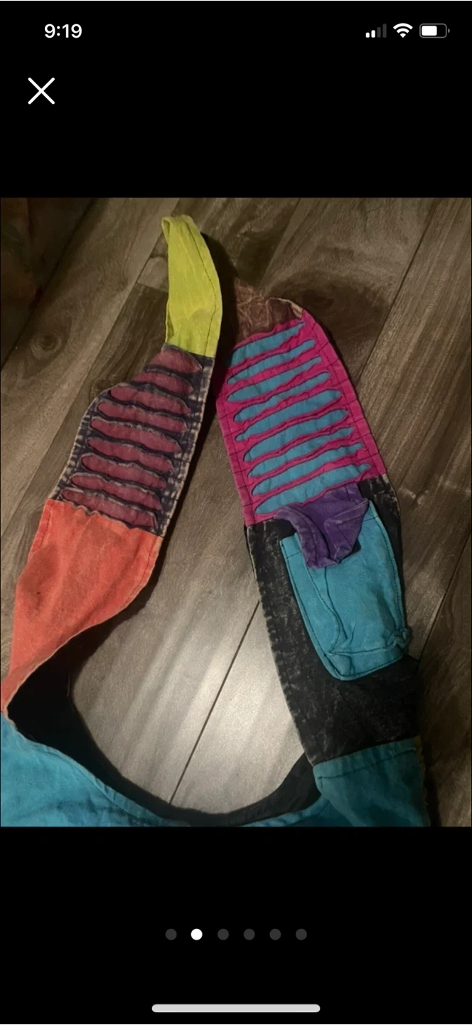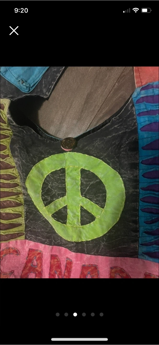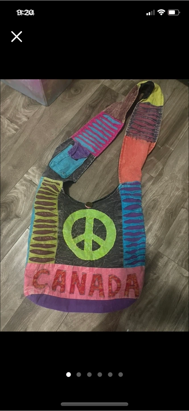 312Unique shoulder bag featuring a peace sign and the word 'CANADA'! It's a colourful and eye-catching accessory. The bag has a button closure.