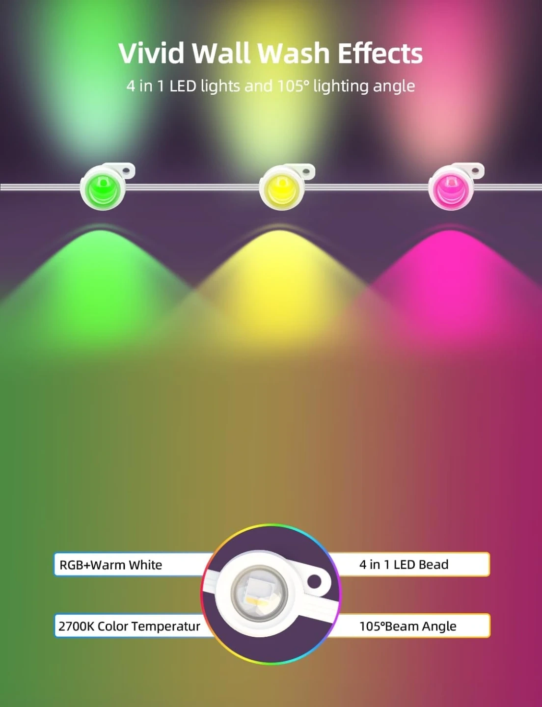 Vivid Lighting Effects: 4-in-1 RGB+WW lens design with beam angle up to 105° and the wall washing depth up to 16 inches. It is recommended to install the lights 2-4 inches away from the wall surface. With 2700K color temperature, the warm white light brightness up to 40lm each, good for daily lighting. RGB brightness up to 25lm each, creating personal ambiance. This string lights support color changing and brightness adjustable
