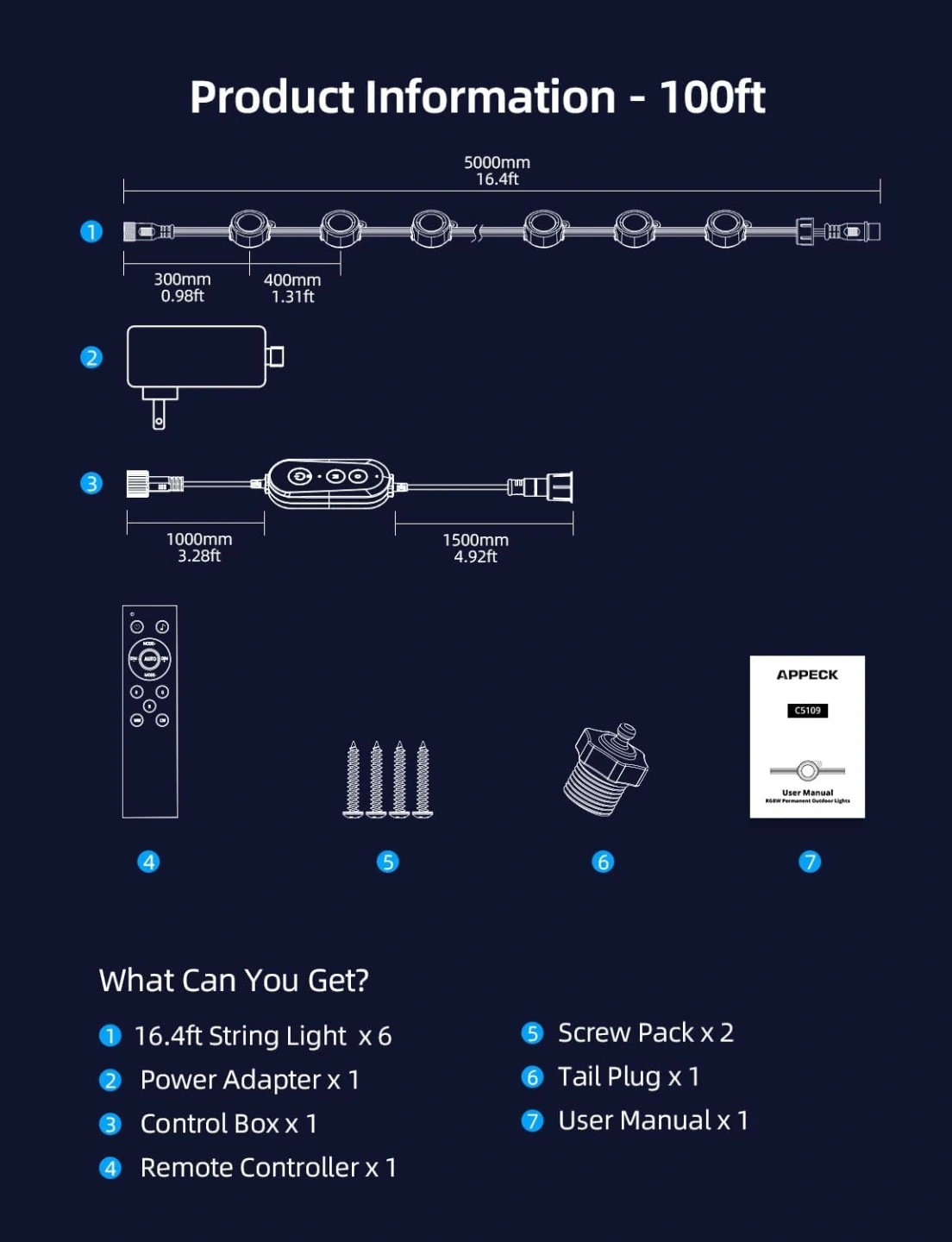 Size Details: 1) The power cord from the adapter to the first light is 9.19ft/2.8m 2) The wire length from the first light to the last light is 96.44ft/29.39m 3) The wire length between 2 lights is 1.31ft/0.4m; When the connector appears between 2 lights, the wire length is 1.97ft/0.6m 4) Total length is more than 100ft, include the wire length of the power adapter(8.2ft), 16.4ft light string *6