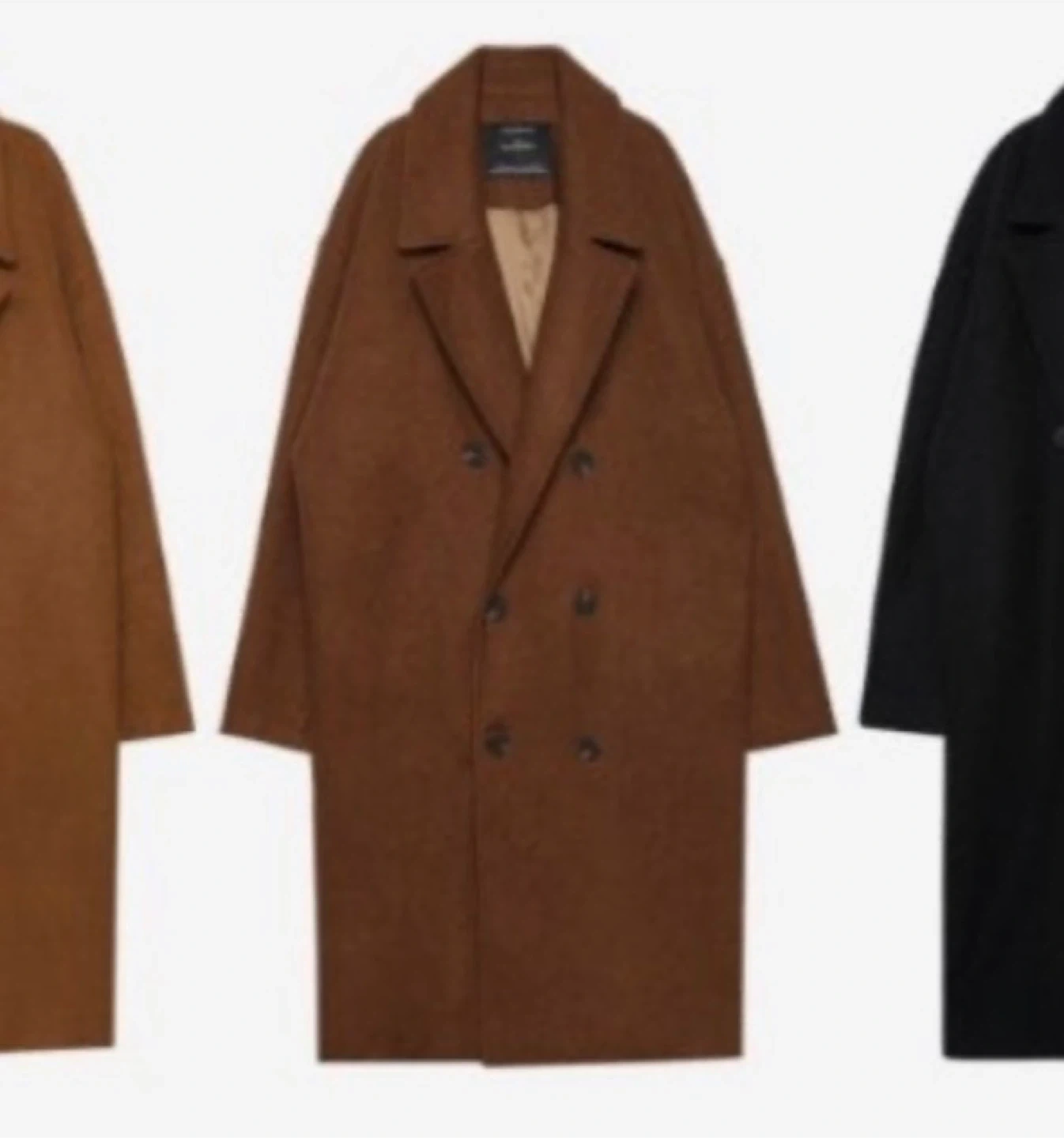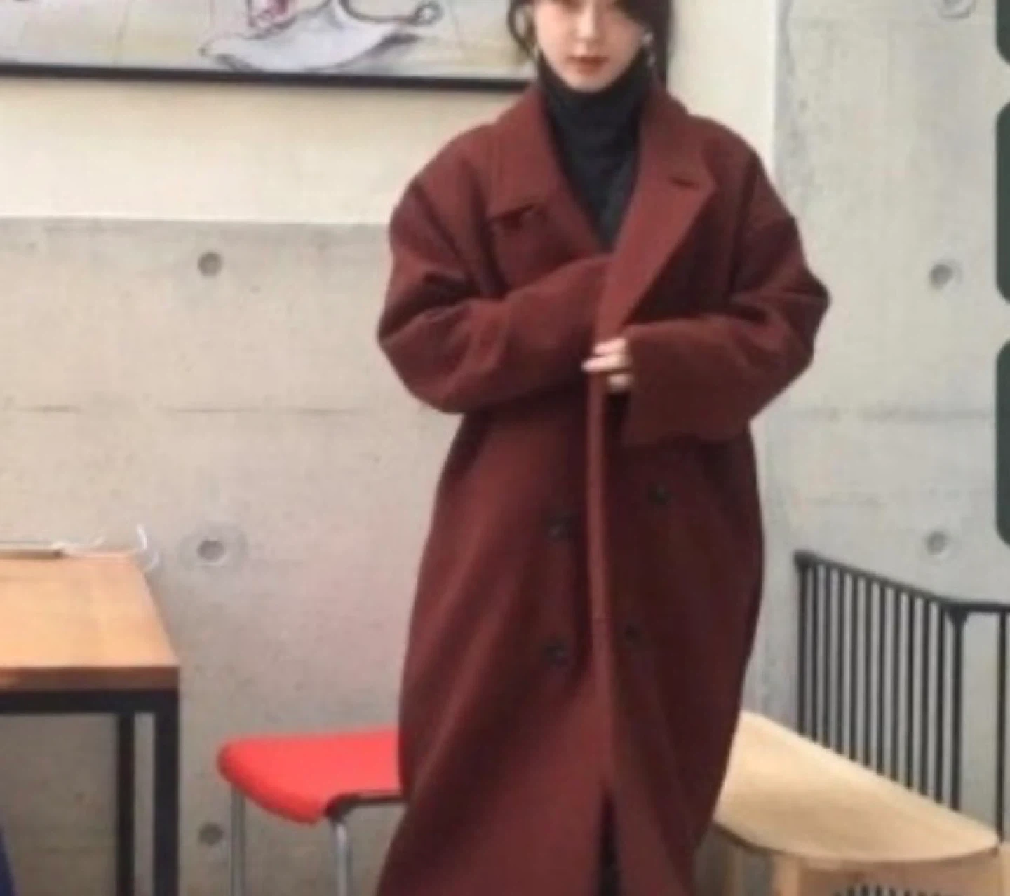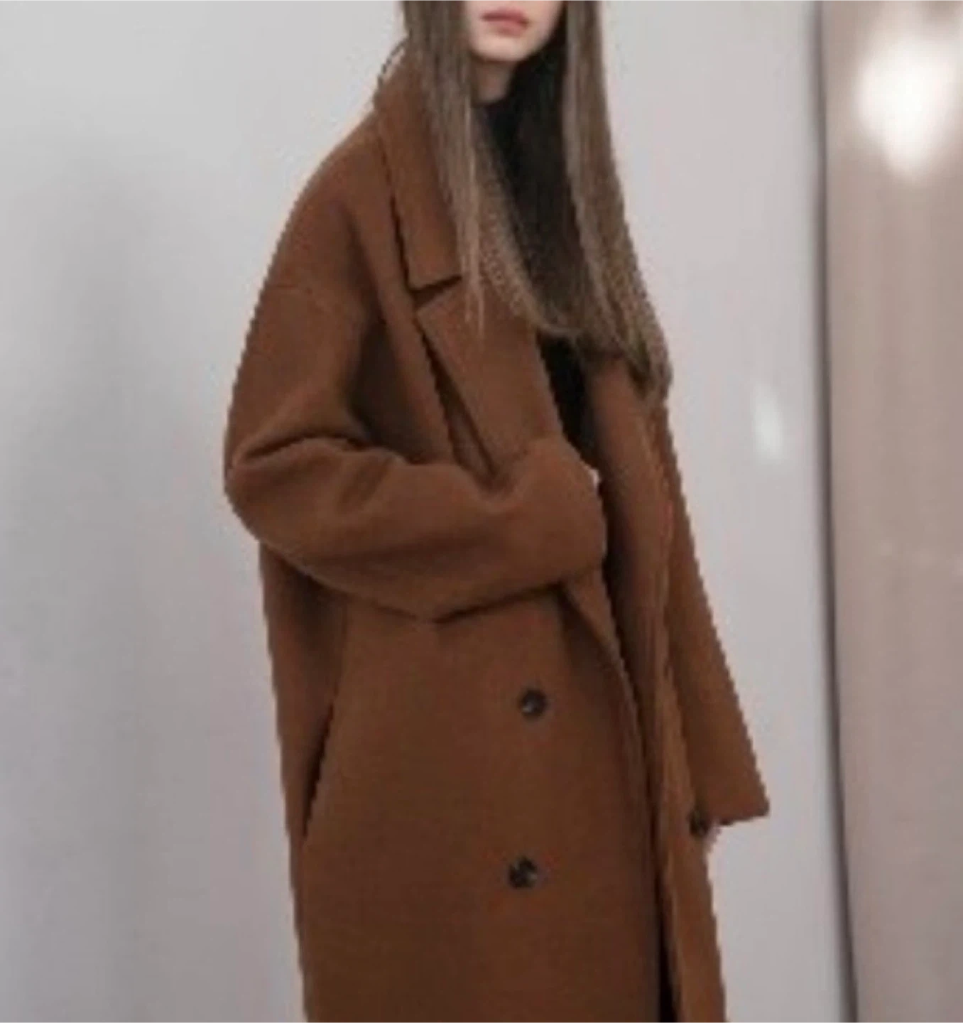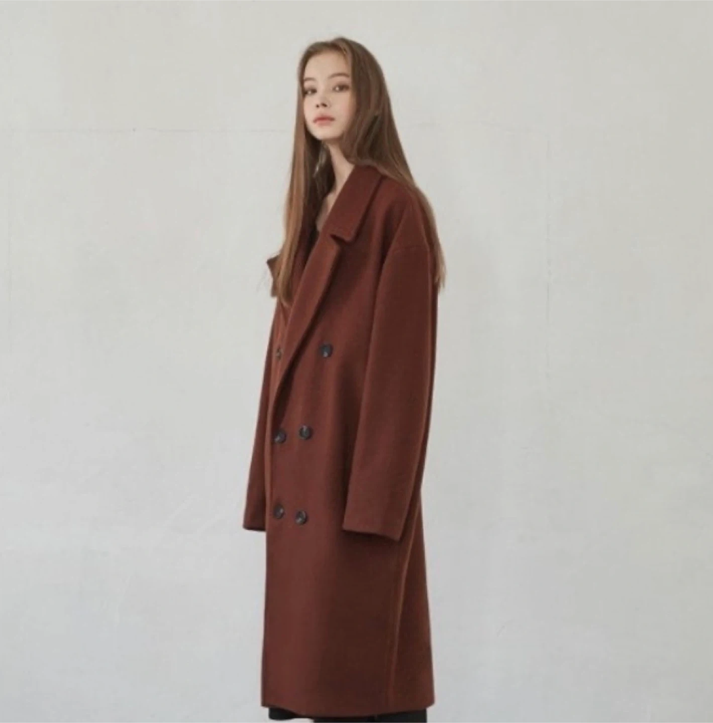 29Classic oversized double-breasted wool coat in a rich brown shade. Features a relaxed silhouette with wide lapels and a long length that creates a chic, minimal look. It’s not thin and keeps you warm in winter. I’m 164 cm (about 5’5”) tall, and it fits me perfectly in an oversized style. Measurements Shoulder: 61 cm Bust: 67 cm Sleeve: 57 cm Length: 112 cm Material Wool 31%, Polyester 69%