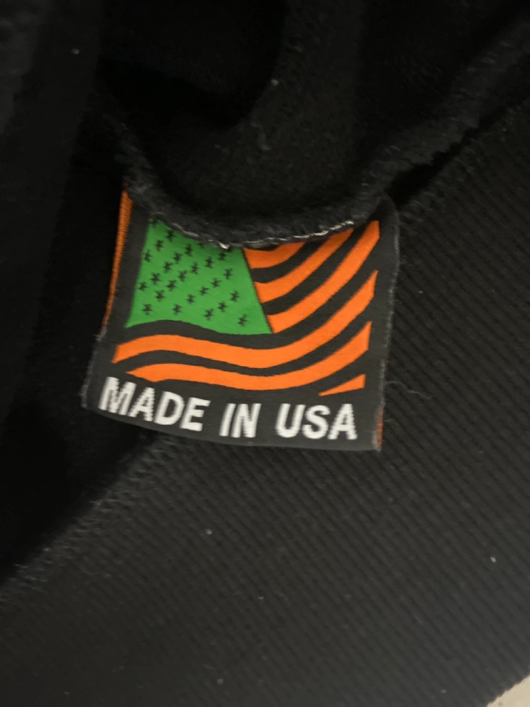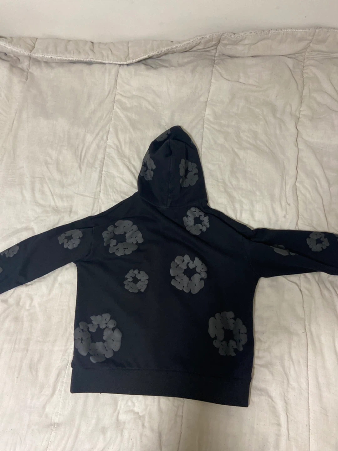 26Selling a Denim Tears hoodie in black, size large. The hoodie features a unique floral pattern. It's made in the USA and the care instructions are: hand wash, no bleach, cool iron, do not dry clean, and no tumble dry