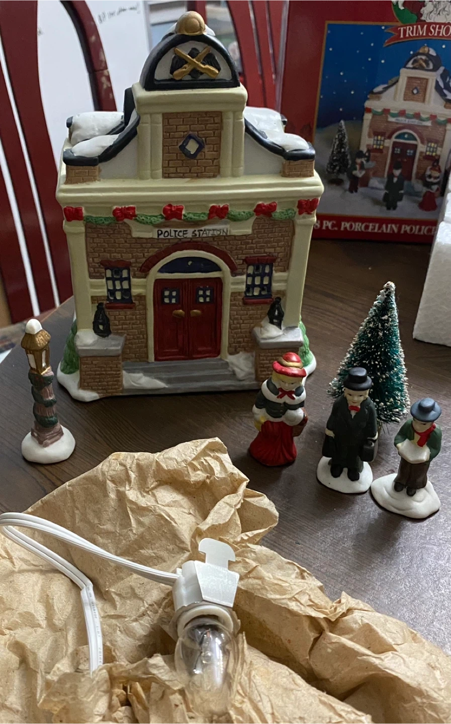 47Selling a Santa's Trim Shoppe 8-piece porcelain police station set! The set includes: - 1 porcelain house - 3 figurines - 1 porcelain lamp post - 2 sisal trees It also includes a 6' CSA cord with an on/off switch. Box included!
