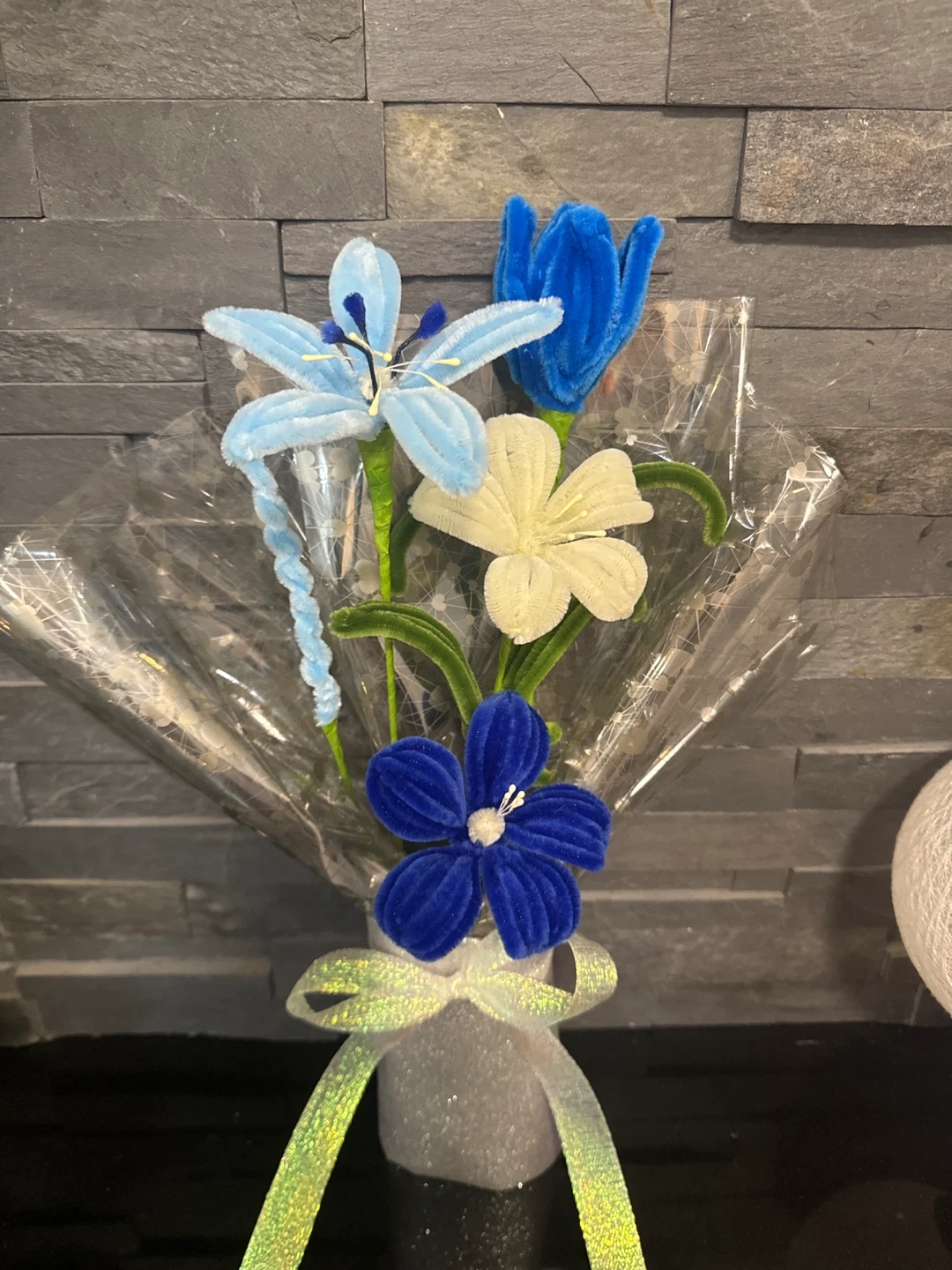 Selling a cute handmade bouquet of pipe cleaner flowers! It features blue, light blue, and white flowers, all bundled together with a sparkly ribbon. Perfect for adding a touch of whimsy to any room