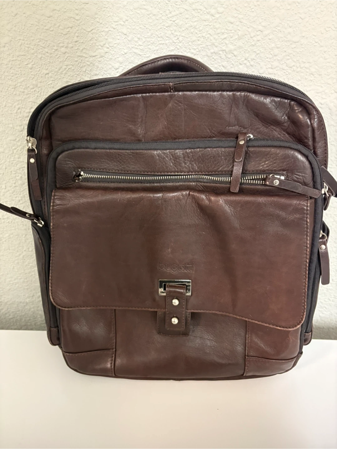 Here's a stylish Bugatti backpack in brown leather! It's perfect for carrying your essentials around town or for travel. The leather has a nice, rich look, and the backpack is in great shape. It has a few compartments to keep everything organized