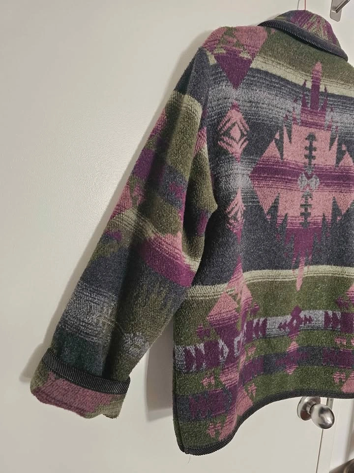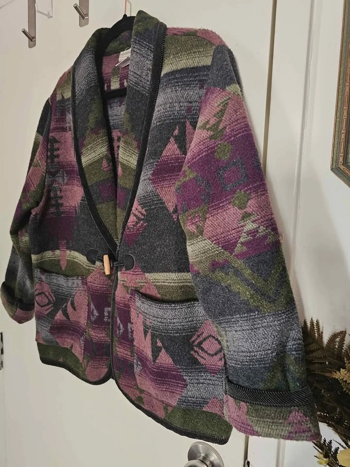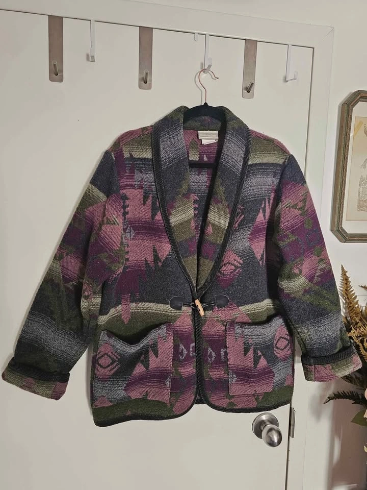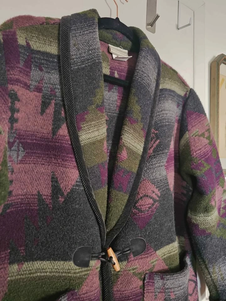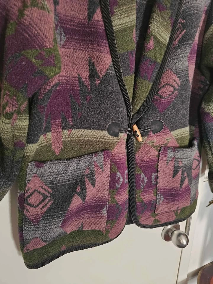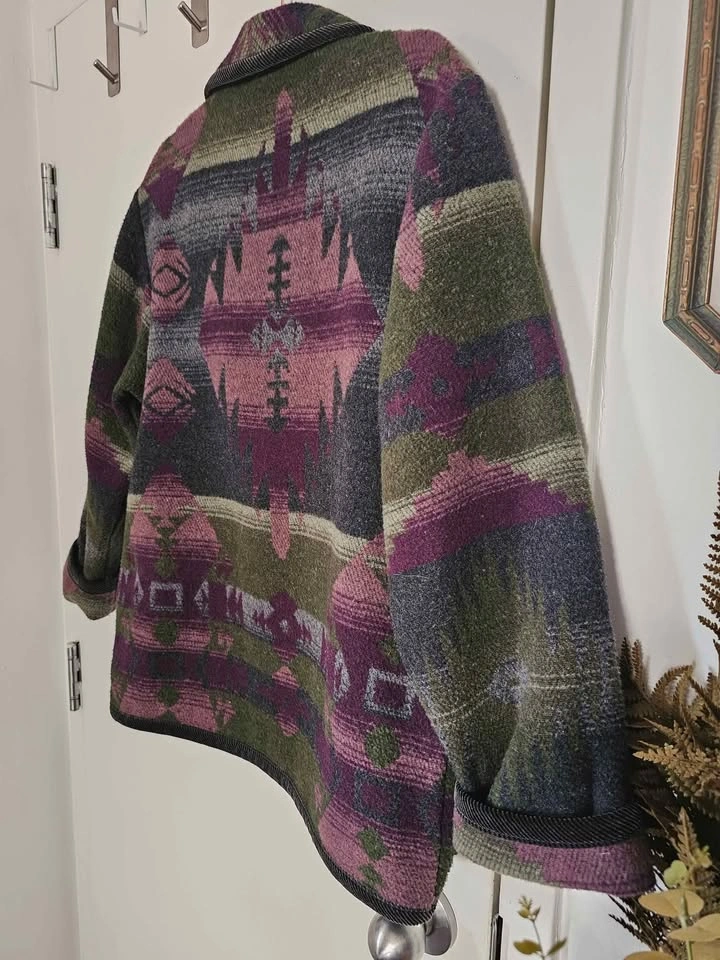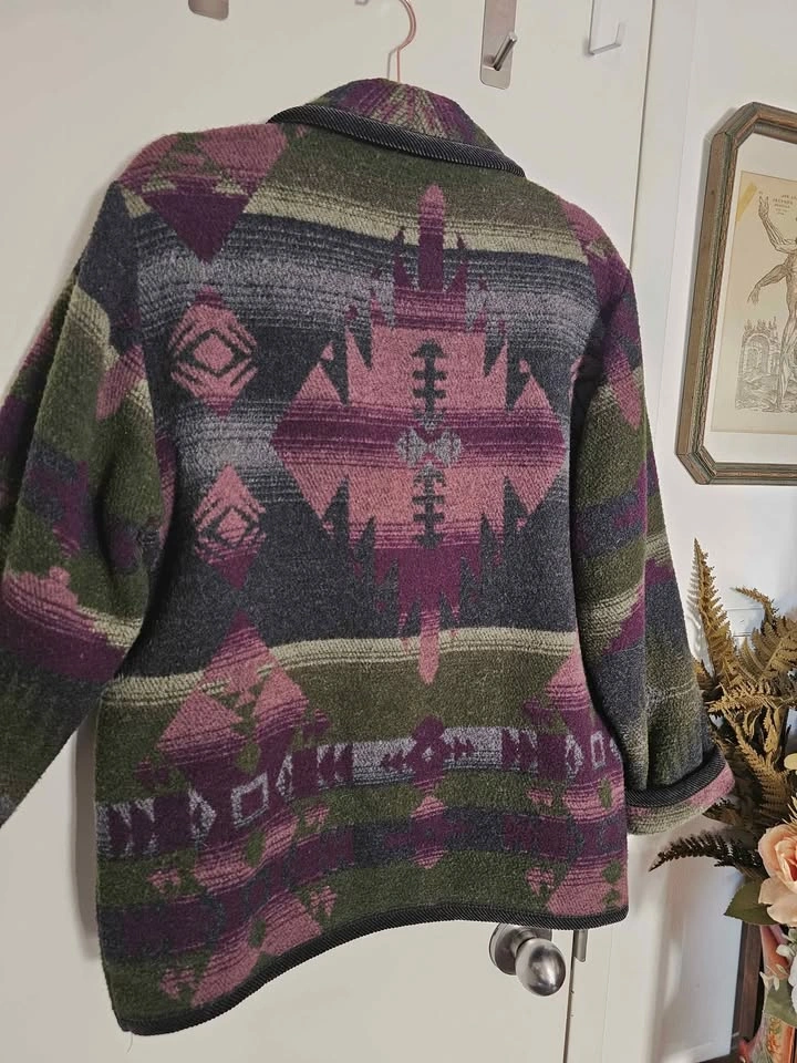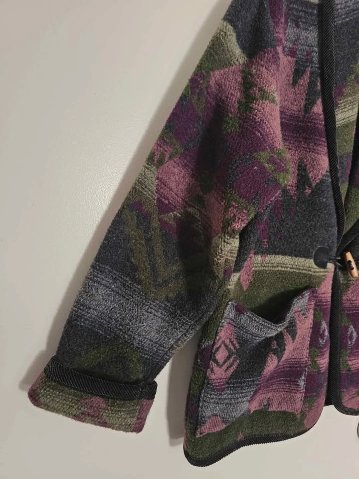 Vintage 80s/ 90s oversized blazer jacket in an earthy Southwestern/ Aztec style pattern. Jacket features earthy dark green, purple, and grey tones, and resembles classic cowboy style Southwest blanket coats. Jacket closes with a wooden toggle, and has 2 front patch pockets. The collar, sleeve hems and bottom hem are trimmed with black corduroy fabric. Made of a cozy and warm wool blend material that feels like thick fleece. Jacket is a mens/ unisex cut.