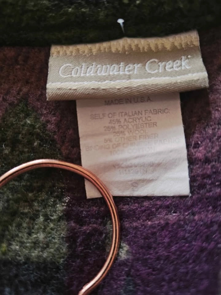 Jacket is in excellent used condition and is an overeized men's Small. Pit to pit measures about 22.5", pit to sleeve hem measures about 17" (but can be longer os sleeves are uncuffed), and shoulder to bottom hem measures about 25.5". Made by the brand Coldwater Creek.