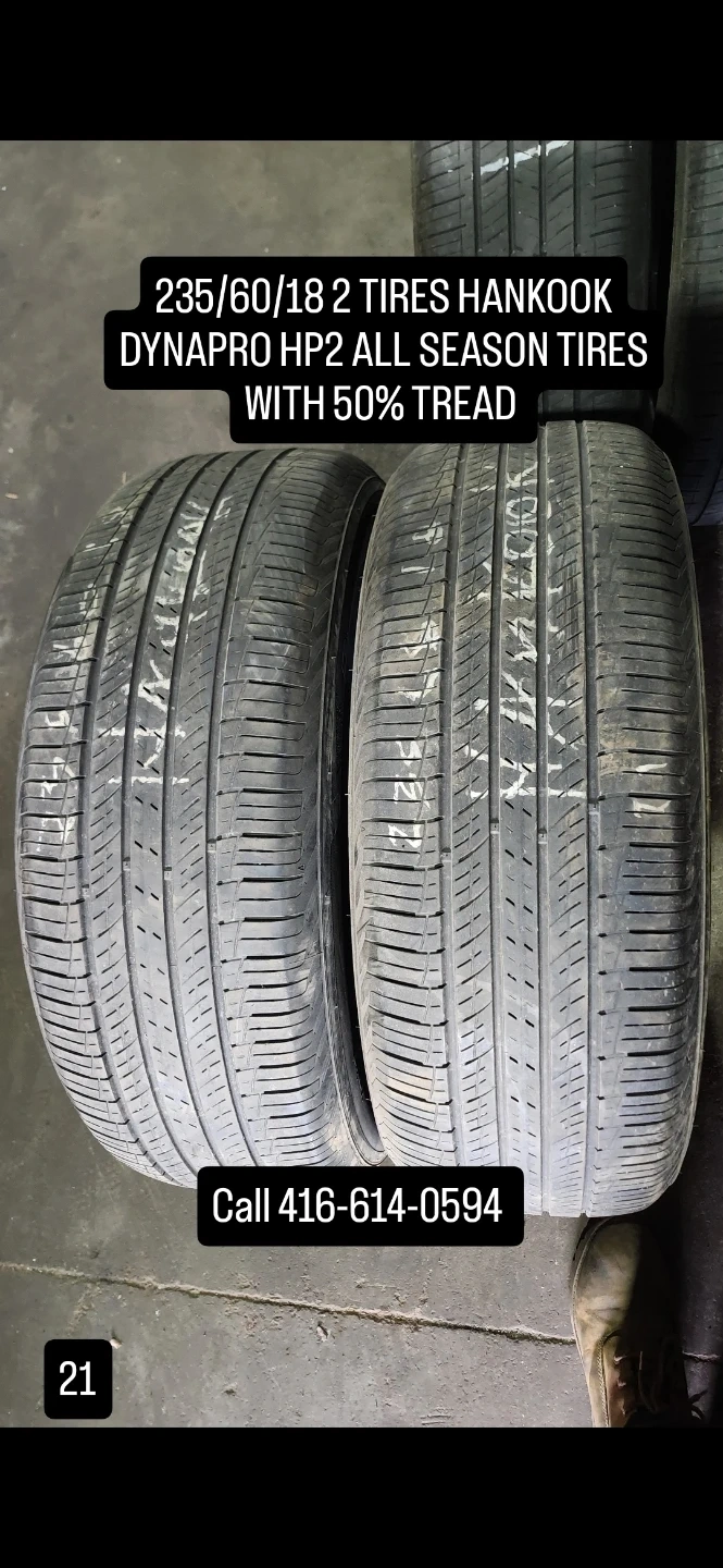 27$50 EACH Selling two Hankook Dynapro HP2 all-season tires, size 235/60/18. They've got about 50% tread left! Call 416-614-0594
