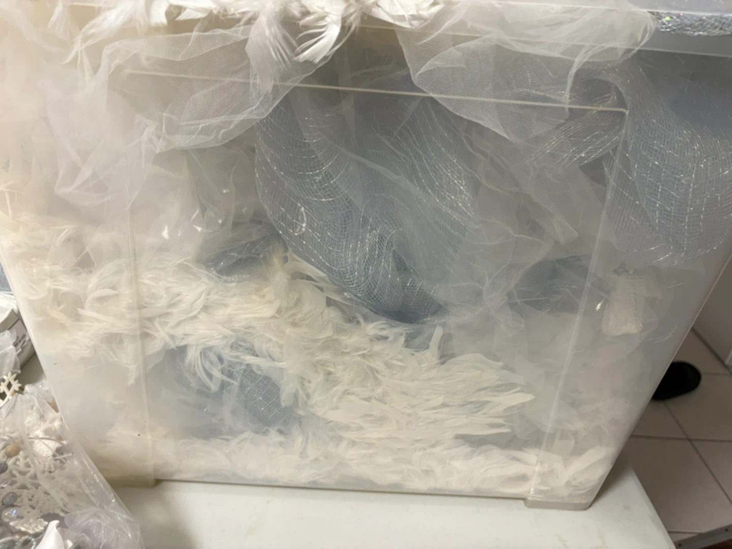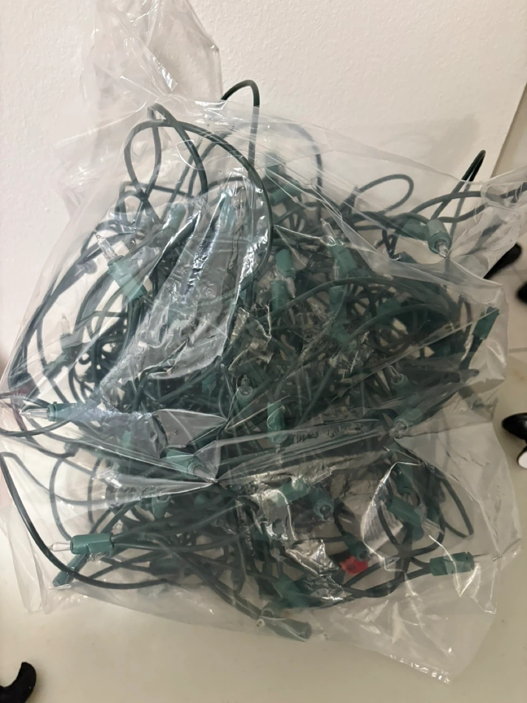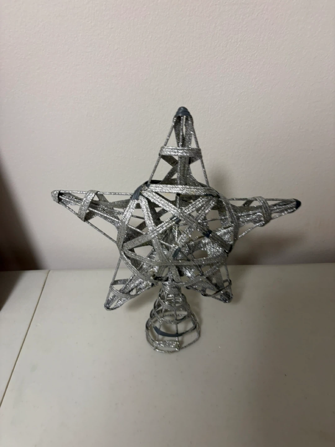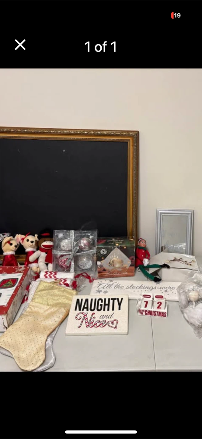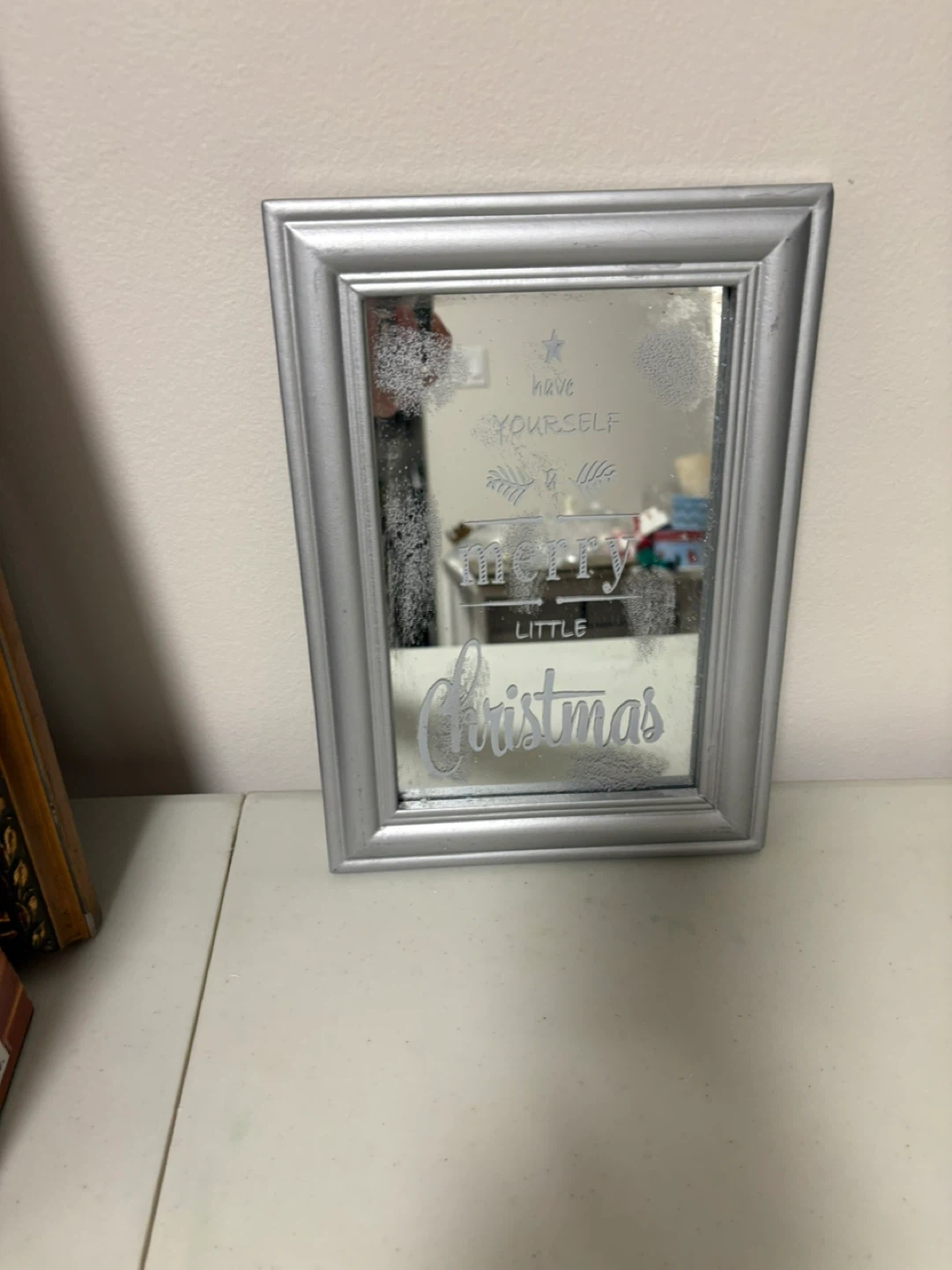 Selling various Christmas decorations including Christmas lights, a small mirror with "Have yourself a merry little Christmas" written on it, and a star decoration