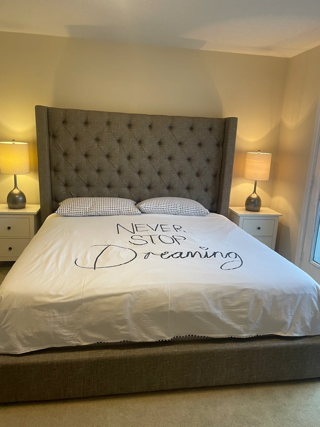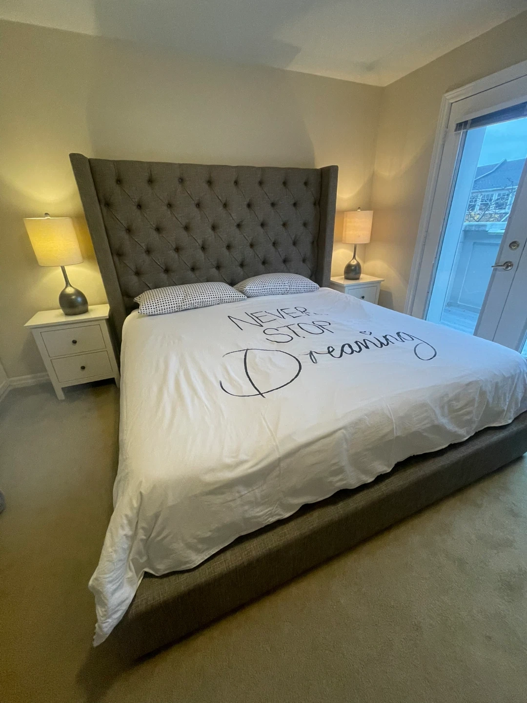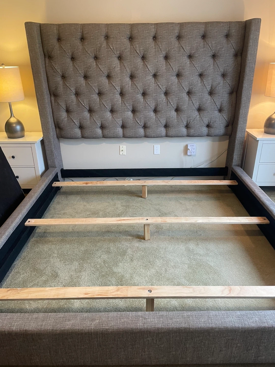 Selling a lovely King-Size upholstered wingback bed. The bed has a stylish, tufted headboard and a neutral colour that would fit well with any decor. It's in great condition and ready for a new home.