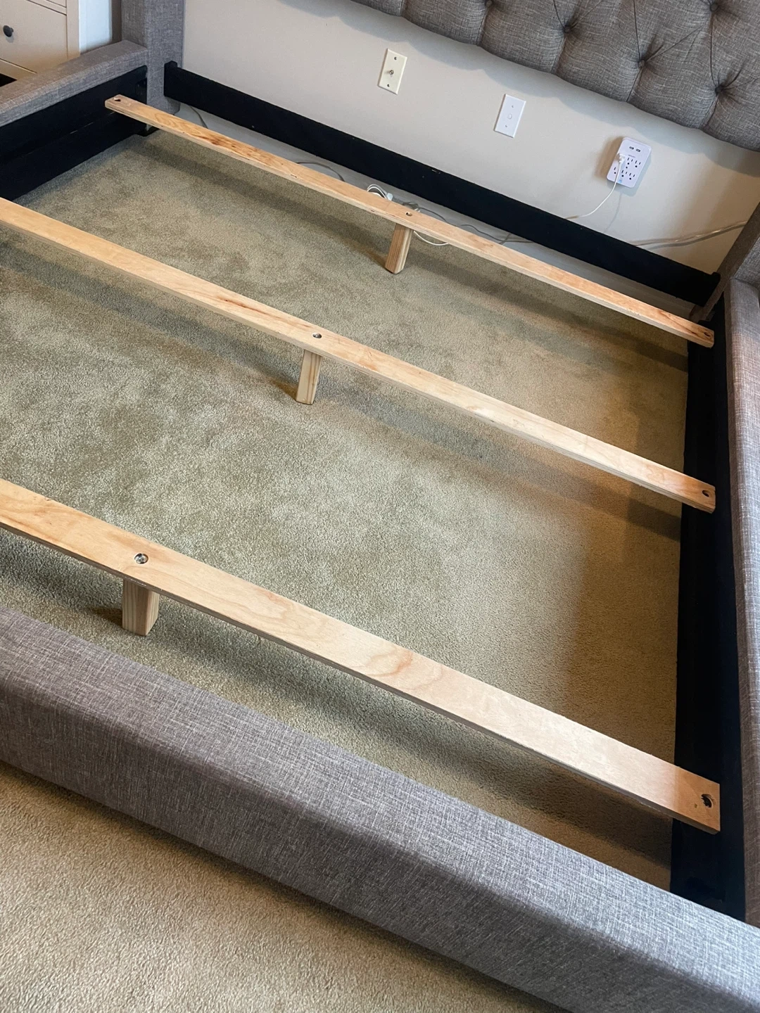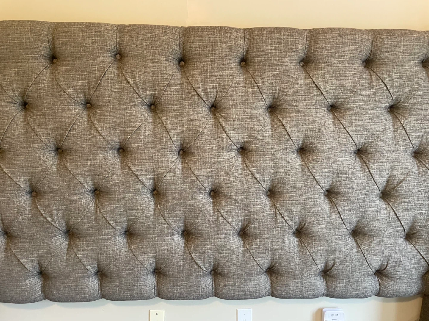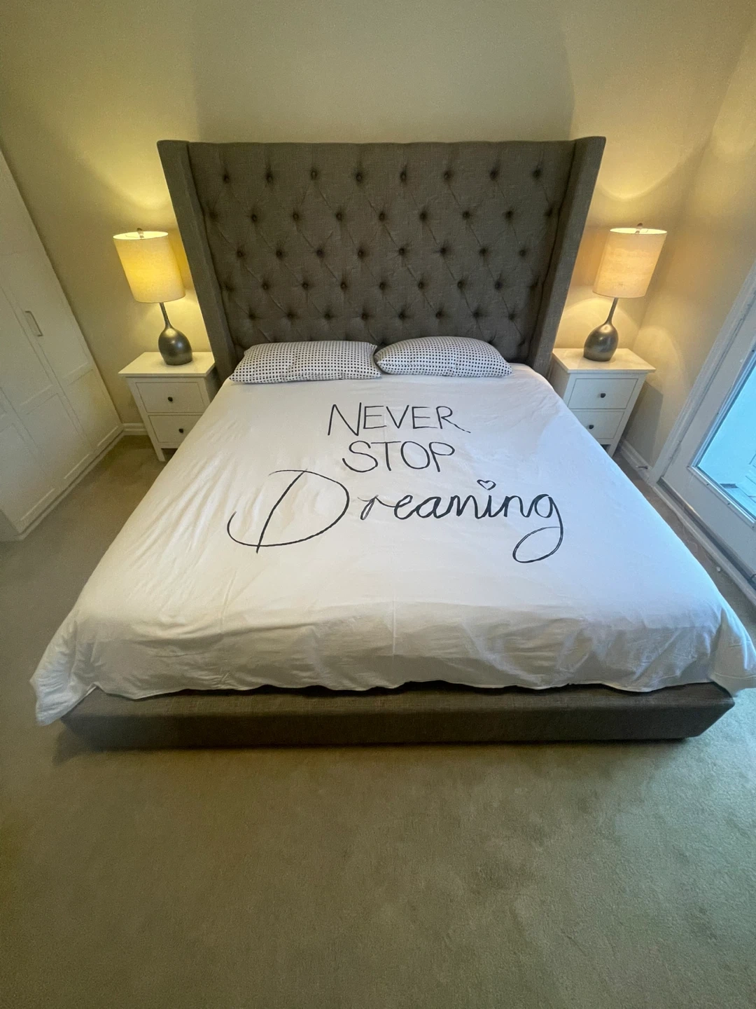Selling a lovely King-Size upholstered wingback bed. The bed has a stylish, tufted headboard and a neutral colour that would fit well with any decor. It's in great condition and ready for a new home.