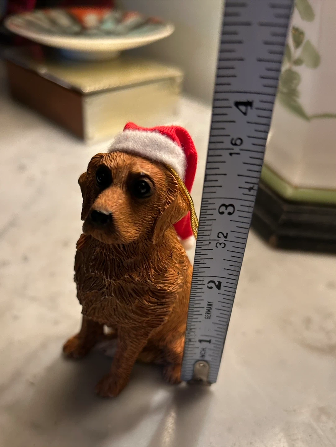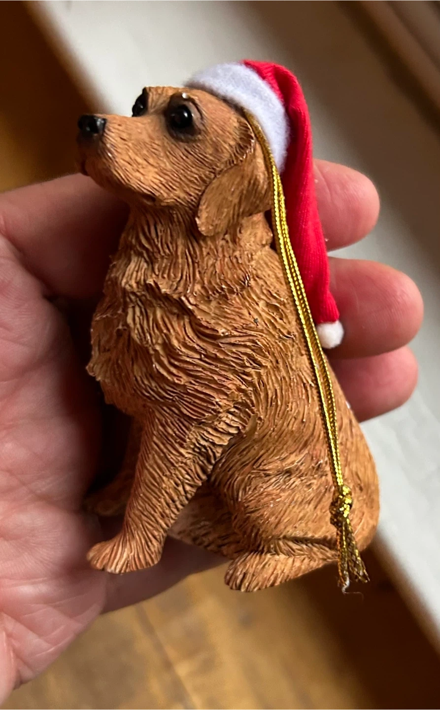 Sandicast Golden Retriever Christmas ornament xmas 3.5 inches santa hat dog bulb cute Donlands Really charming Sandicast Golden Retriever Dog with Santa Hat Christmas Ornament Collectible Can be hung or stands flat for table or mantel for display Stands 3.5 inches tall 7.00 Flexible re pickup Just south of Leaside bridge Elmsdale Road M4J 3M3 Donlands O'Connor East York Don Mills south exit off DVP