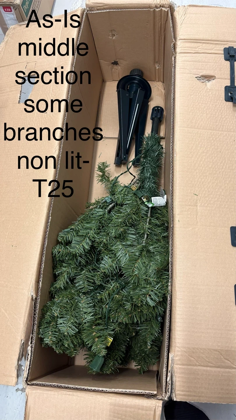 Selling a Holiday Time 7-ft Pre-Lit Brinkley Pine Christmas tree. It comes with clear lights and has a 2.5 ft diameter. The tree height is 7 ft and it has 300 pre-strung mini lights and 903 branch tips. Bulbs stay lit if one burns out. Includes the box!