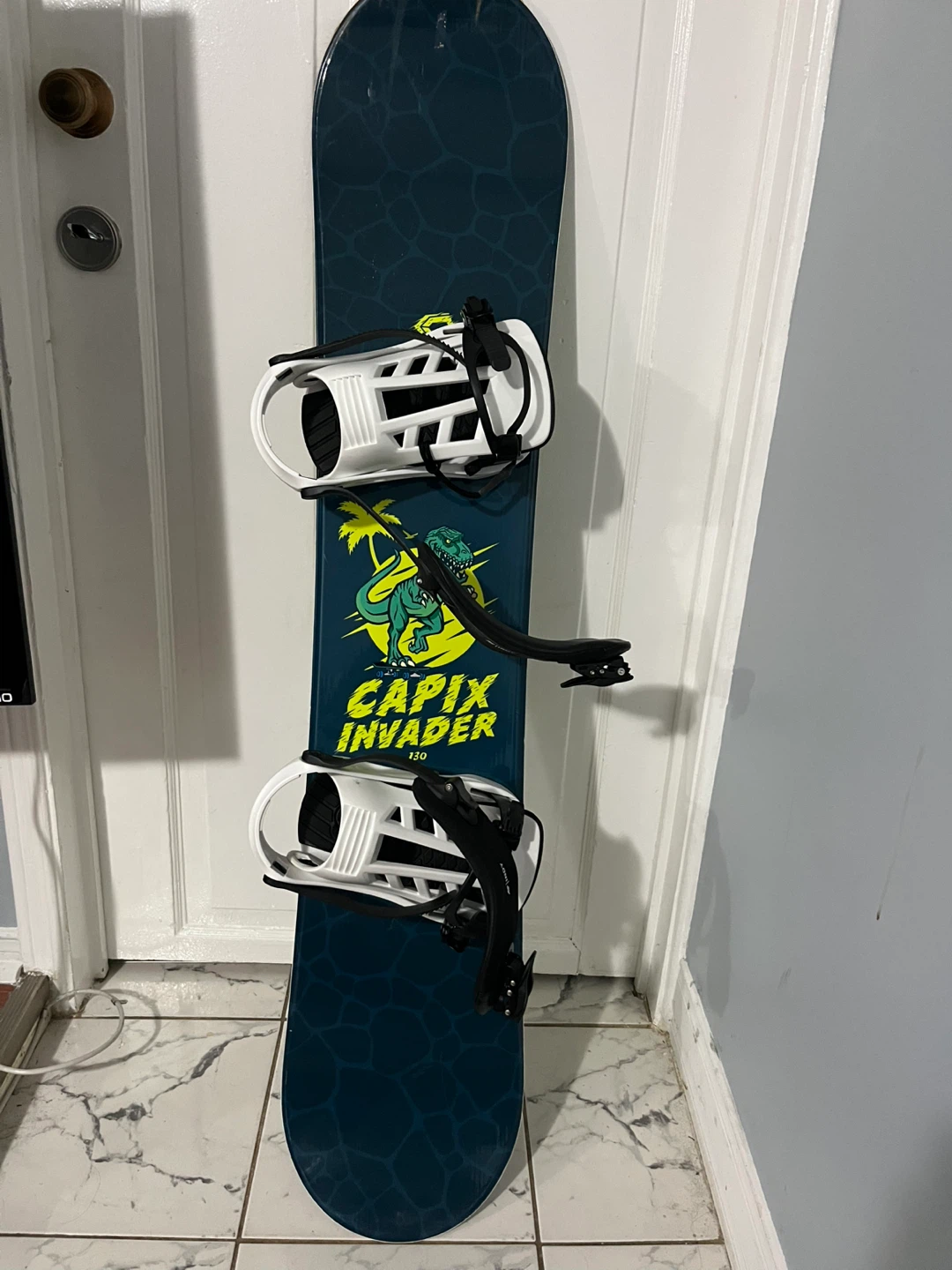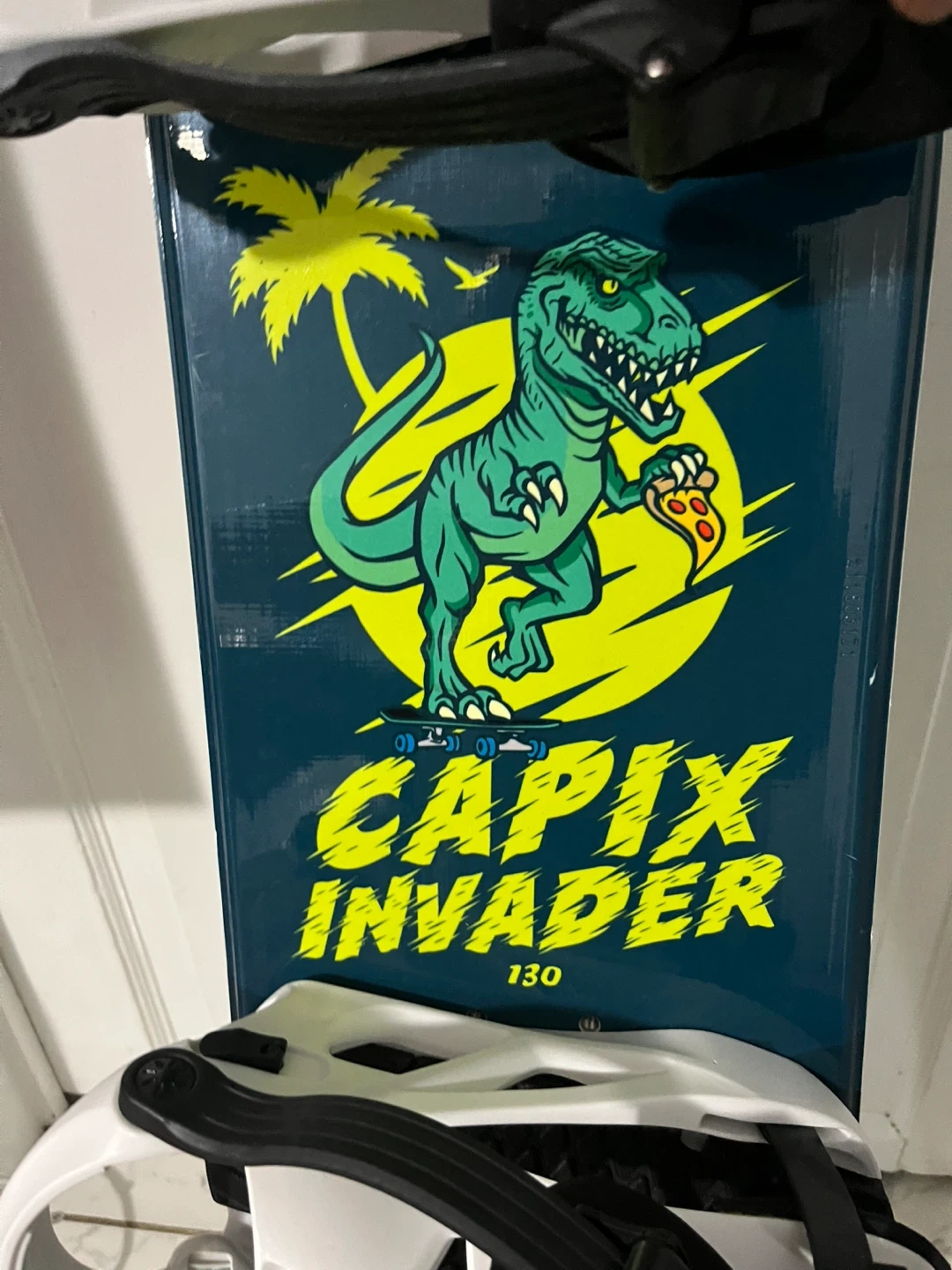 Selling a Capix Invader snowboard, size 130. It has a cool dinosaur graphic on it! It also comes with K2 Indy bindings. Boots K2 Vandal snowboard boot designed for young riders its in size 7mens.