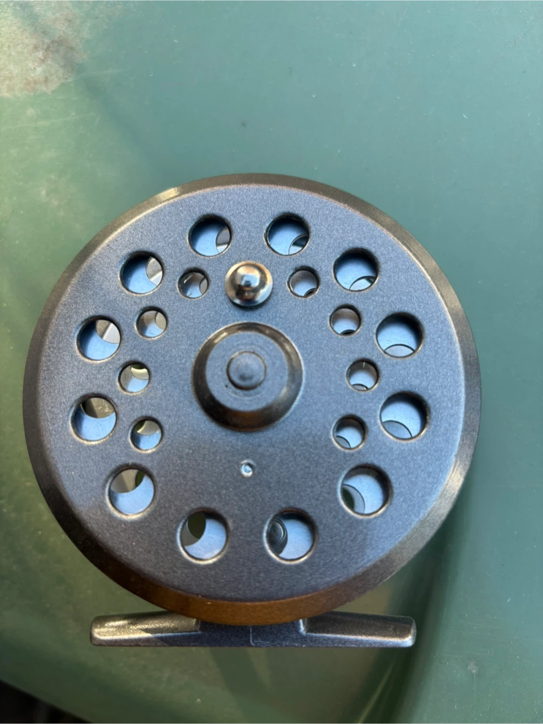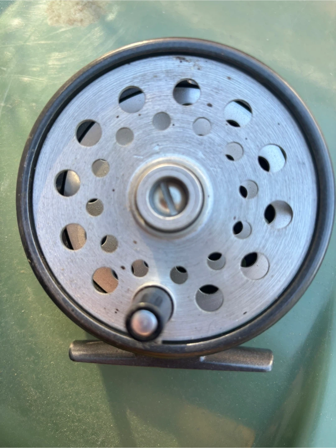 380Selling a vintage fly fishing reel. It has a classic design with a series of holes on the spool face. It shows some signs of wear, but is in overall good condition for its age. Perfect for collectors or those who appreciate vintage fishing gear!