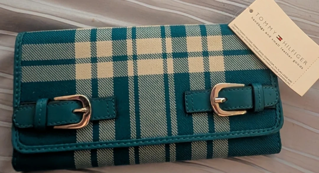 Tommy Hilfiger wallet in a teal and beige plaid pattern. It has a snap closure and buckle details on the front. Inside, there are multiple card slots and a zippered coin pocket. Brand new with tags!